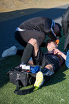 Ólafur Örn HK-ingur er einnig utanvallar eftir samstuðið. Sjúkrateymið er að vinna að því að koma honum aftur inná. Það tekst, vel vafinn og flottur kemur hann inná