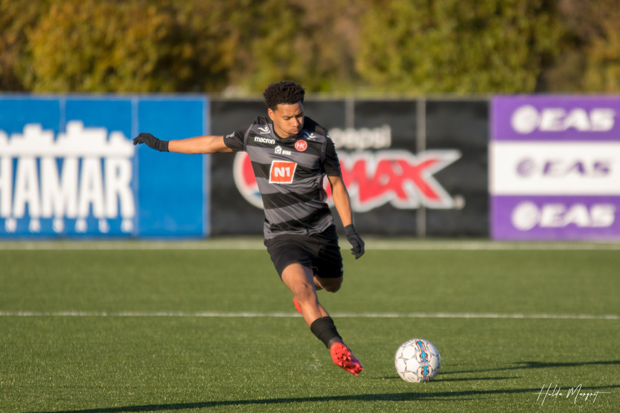 Ísak Jóns hlustar á þjálfara sinn og tekur fína ristarspyrnu inn á teig HK, skot úr teignum endar langt yfir.