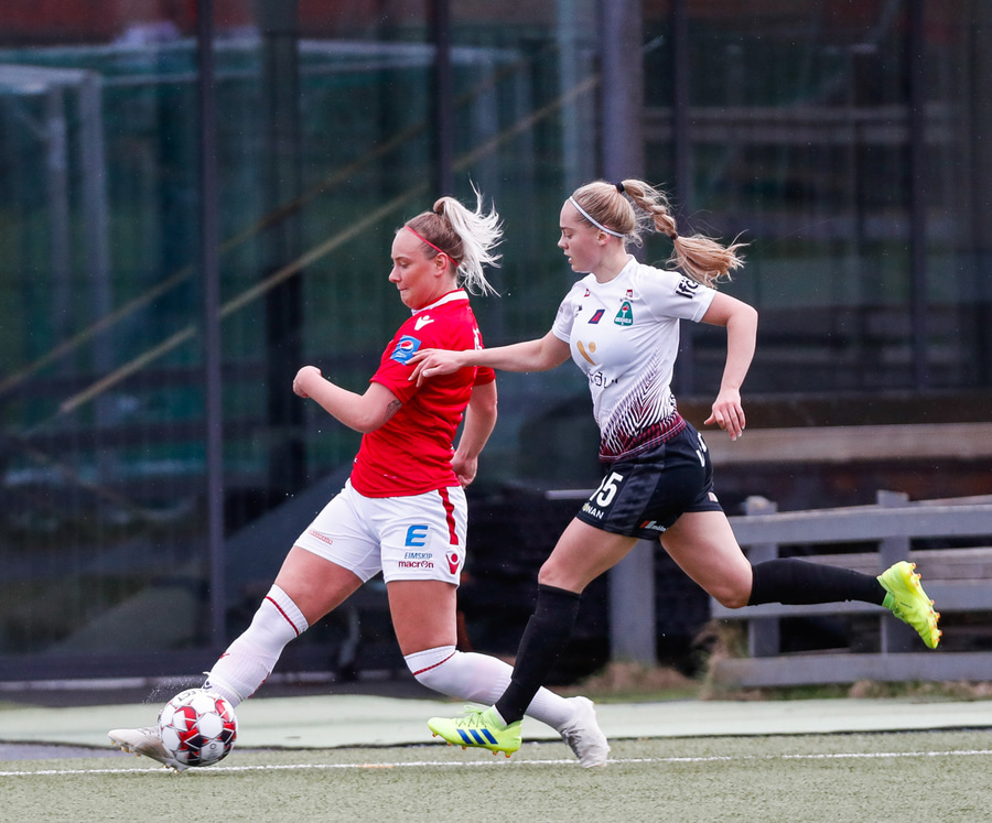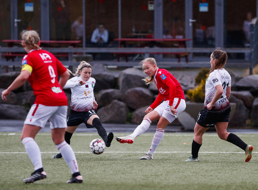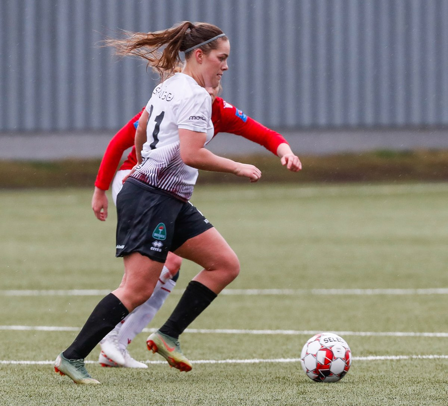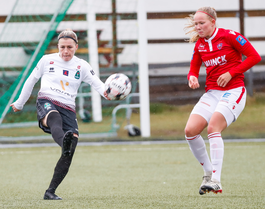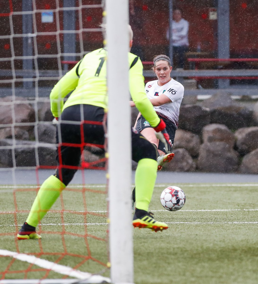 Hlín Eiriks að gera sig líklega en skot hennar fer af varnarmanni. Elín Metta nær boltanum en er of lengi að athafna sig og þetta rennur út í sandinn.