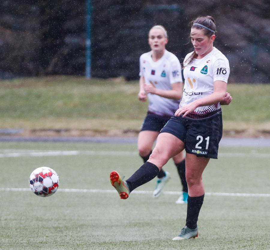 Valskonur að sækja í sig veðri og komast í flotta sókn sem endar á góðri sendingu frá Margréti Láru út á Hallberu sem reynir skot sem fer rétt framhjá markinu!