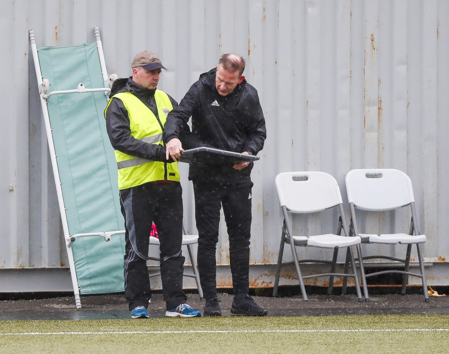 Styttist í leik, Hafliði Breiðfjörð er farinn út til að mynda það sem gerist. Edda Garðars er mætt í fjölmiðlaboxið og byrjuð að syngja ásamt því að Viðar Helgason eftirlitsdómari hefur tekið upp penna blokkina og er klár í slaginn þegar liðin ganga út á völlinn.