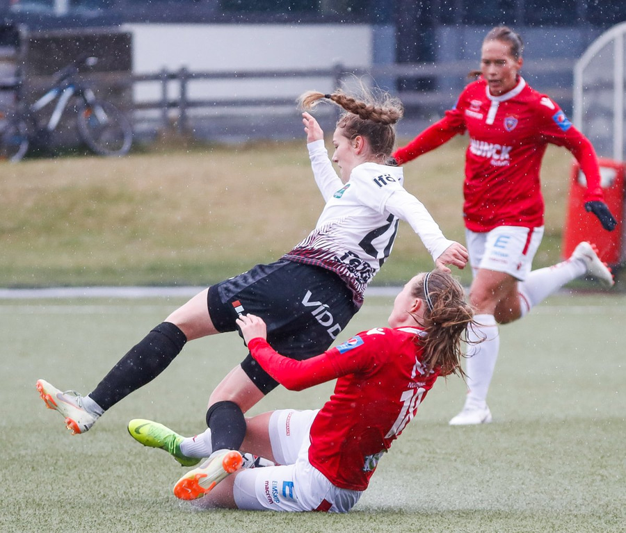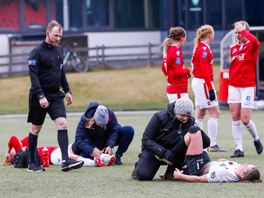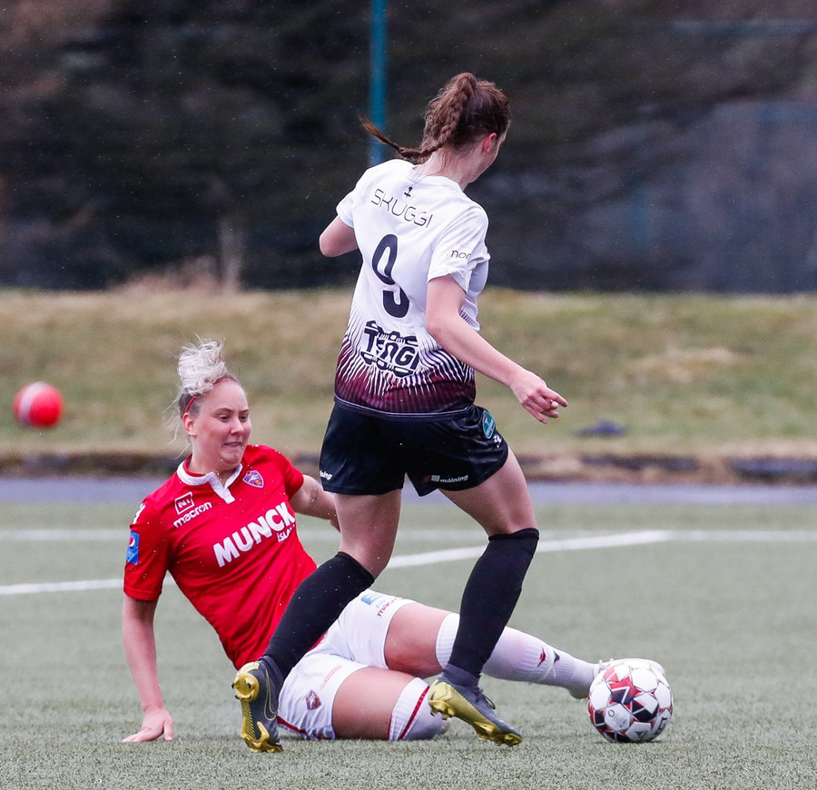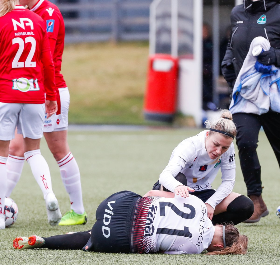 Fyrir brot á Hildi en hann lét leikinn halda áfram. Þetta var ekki falleg tækling og skall Hildur með andlitið beint í gervigrasið.