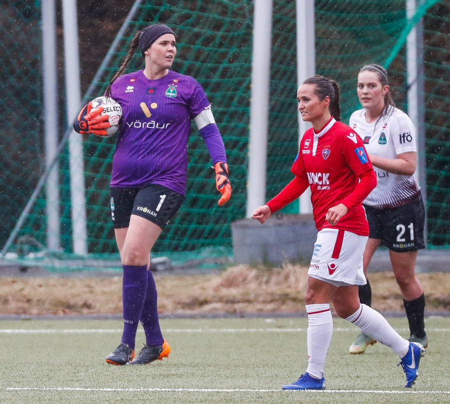 Hvað er að frétta hérna? Rosalega liggur illa á hafsentum Vals í dag. Rífur bara Sólveigu niður þannig að treyjan stækkar um 2 númer!