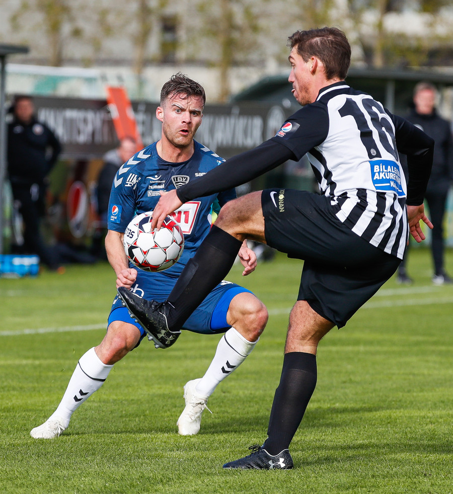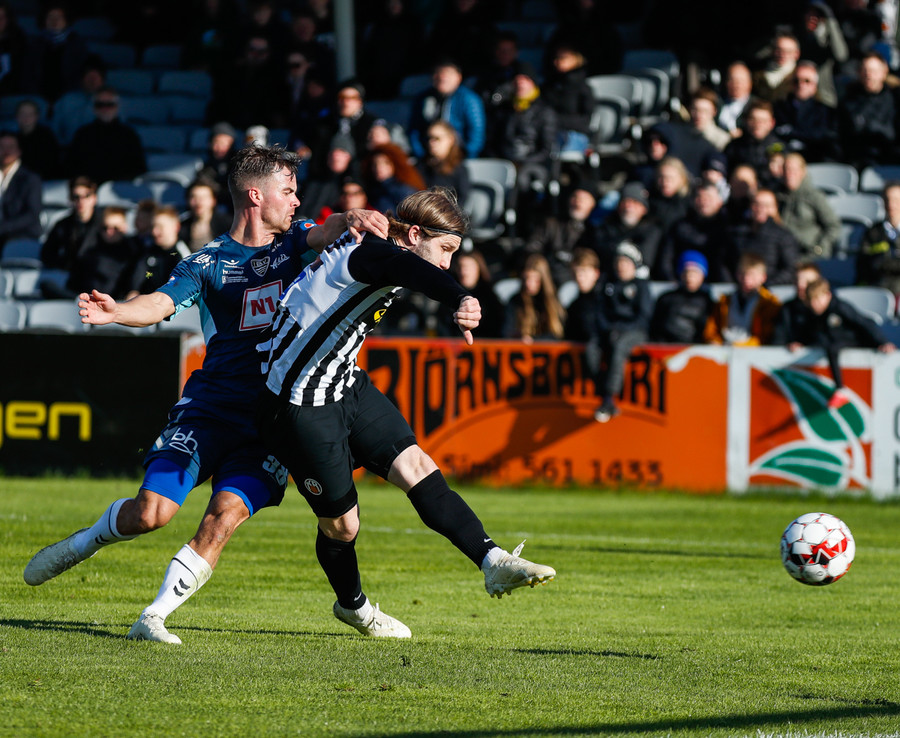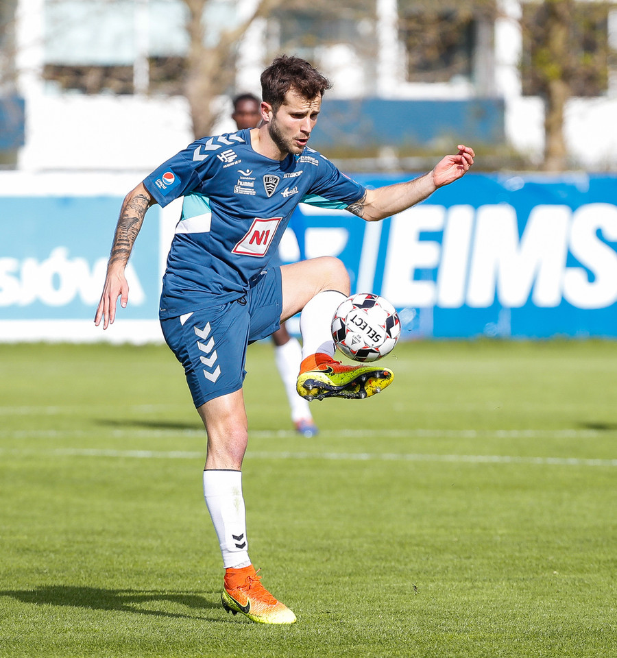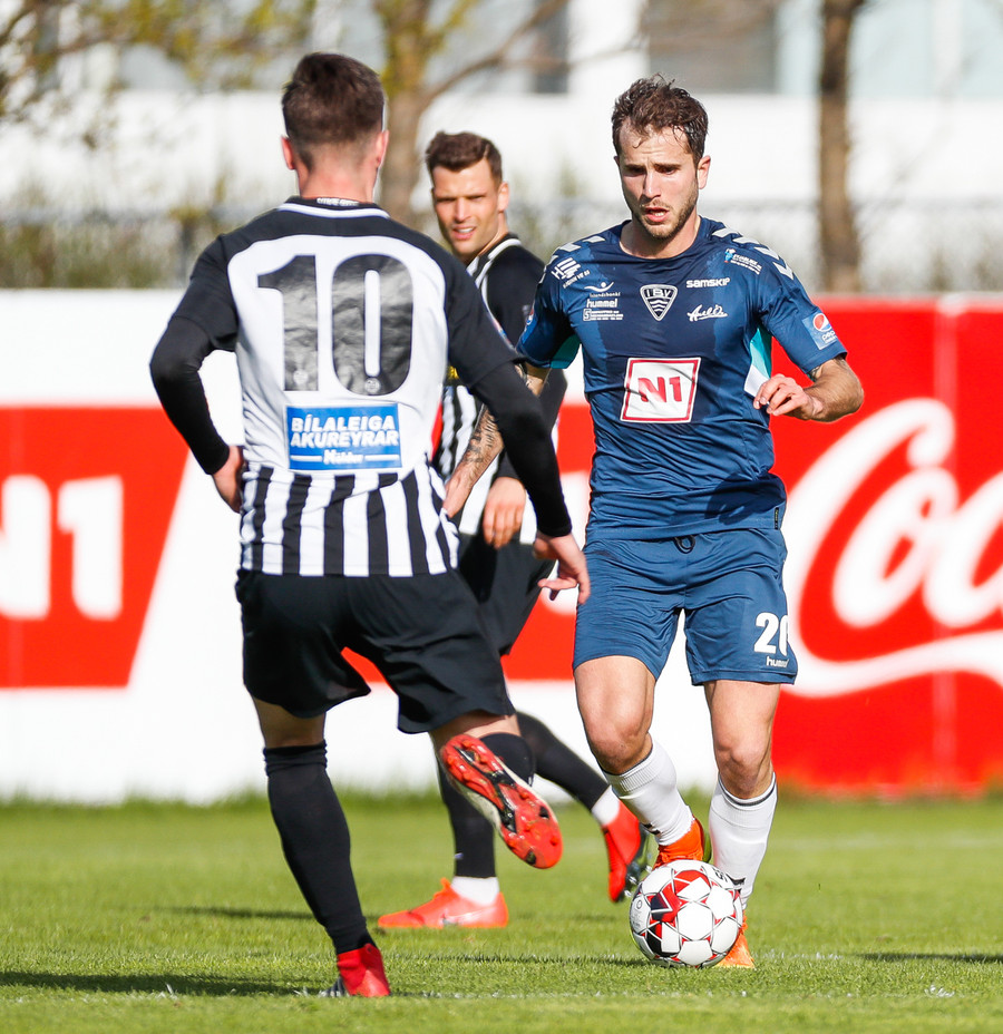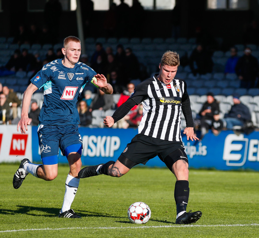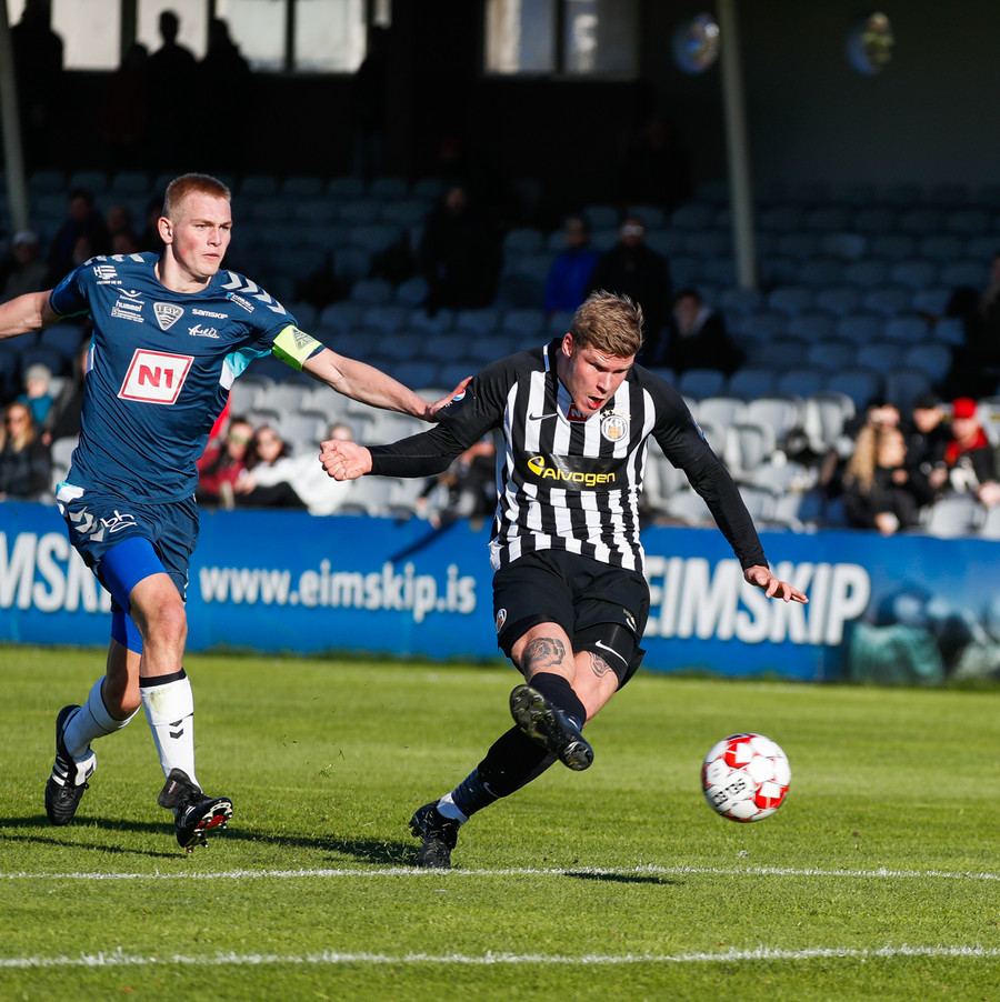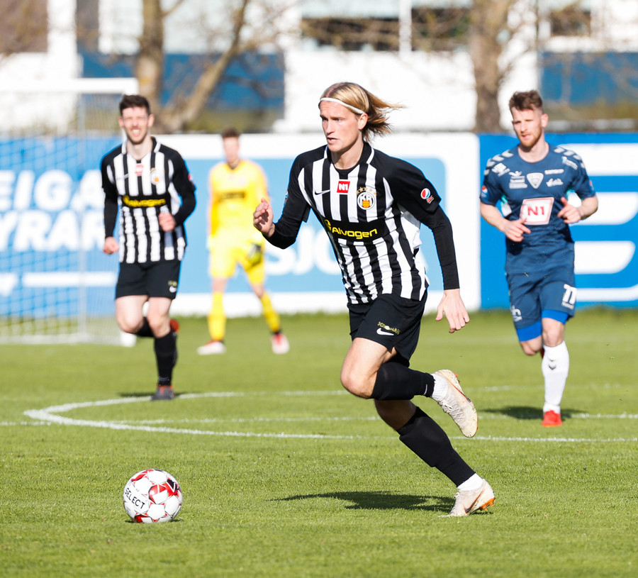 Tobias skallar hér boltann innfyrir á Ægi Jarl en hann skýtur beint í Gilson Correia og útaf í innkast.