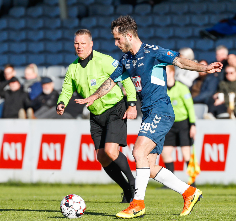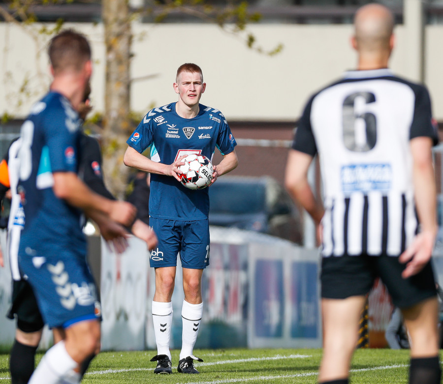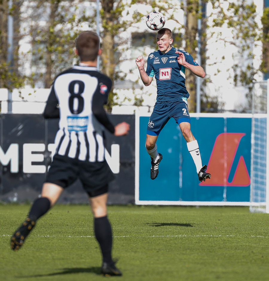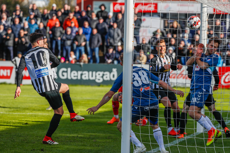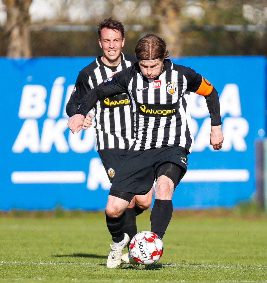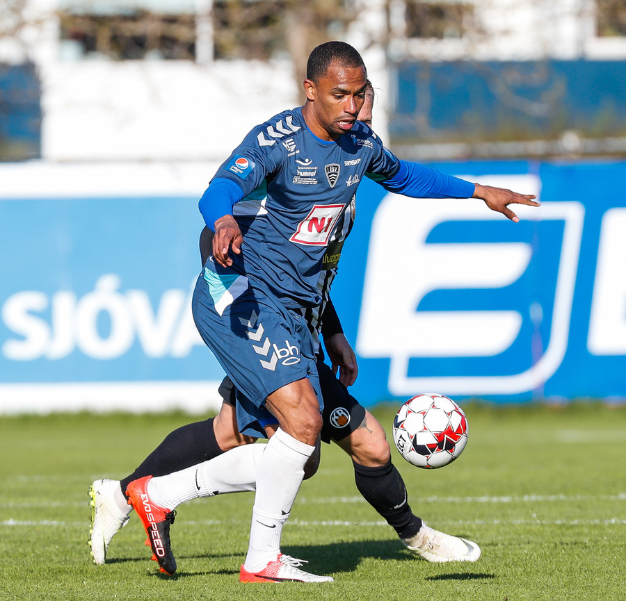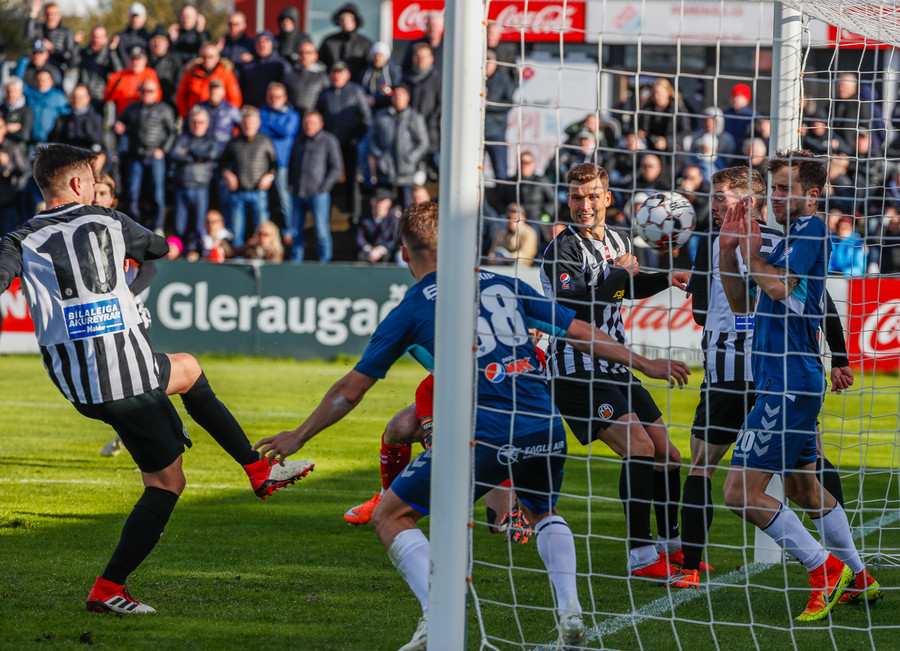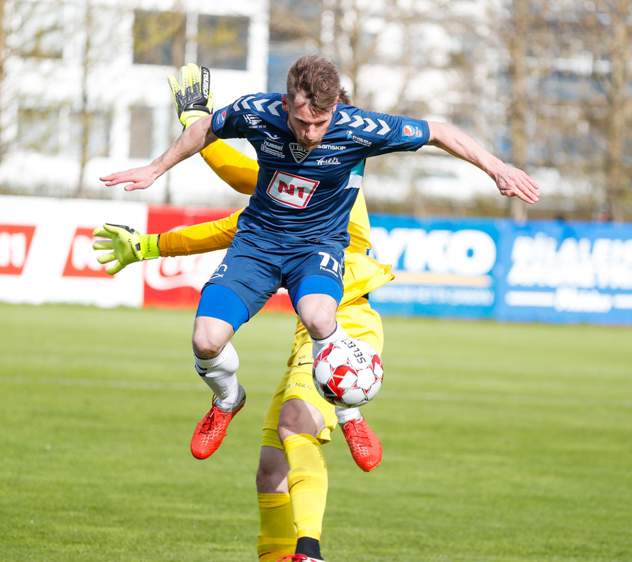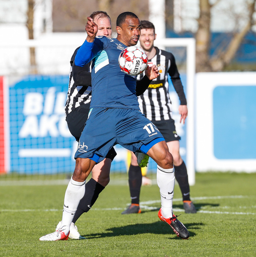 Tobias skallar hér boltann innfyrir á Ægi Jarl en hann skýtur beint í Gilson Correia og útaf í innkast.