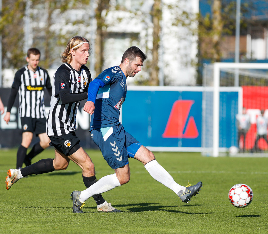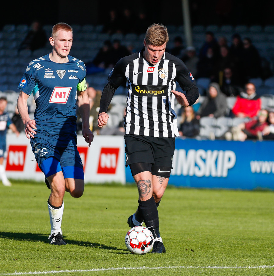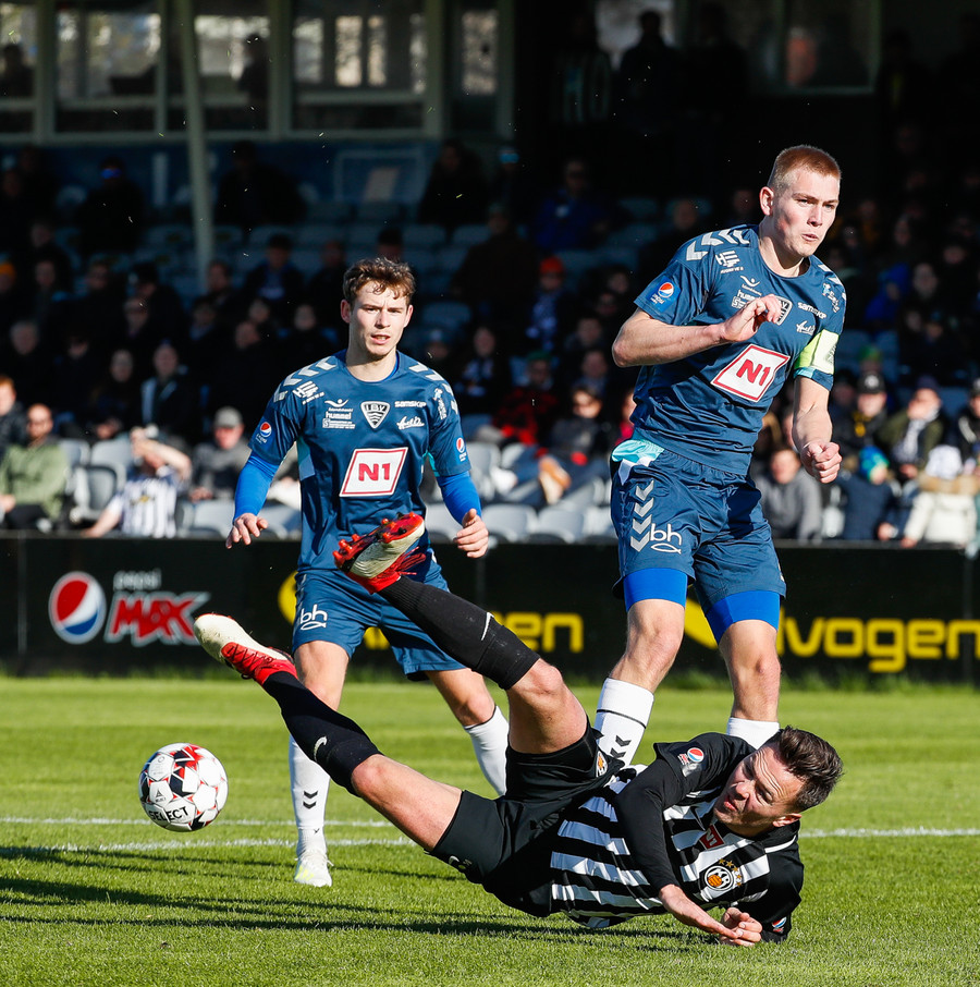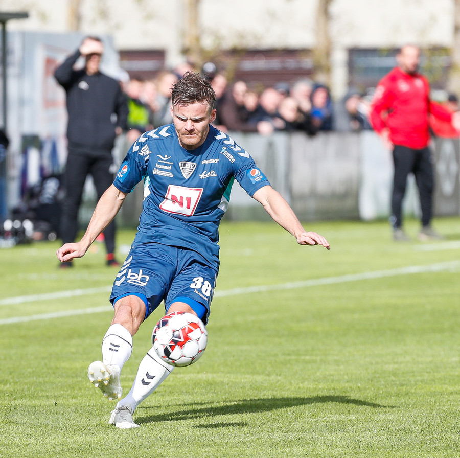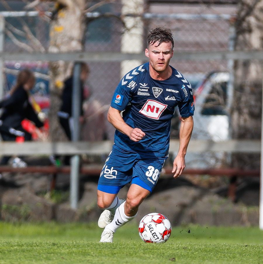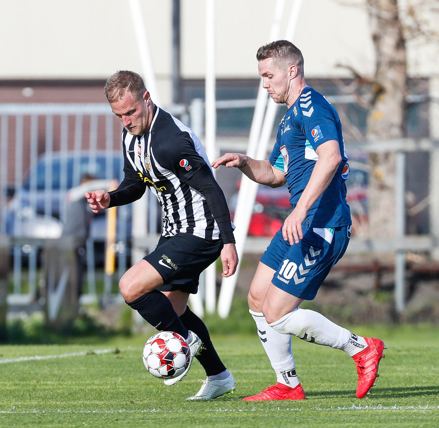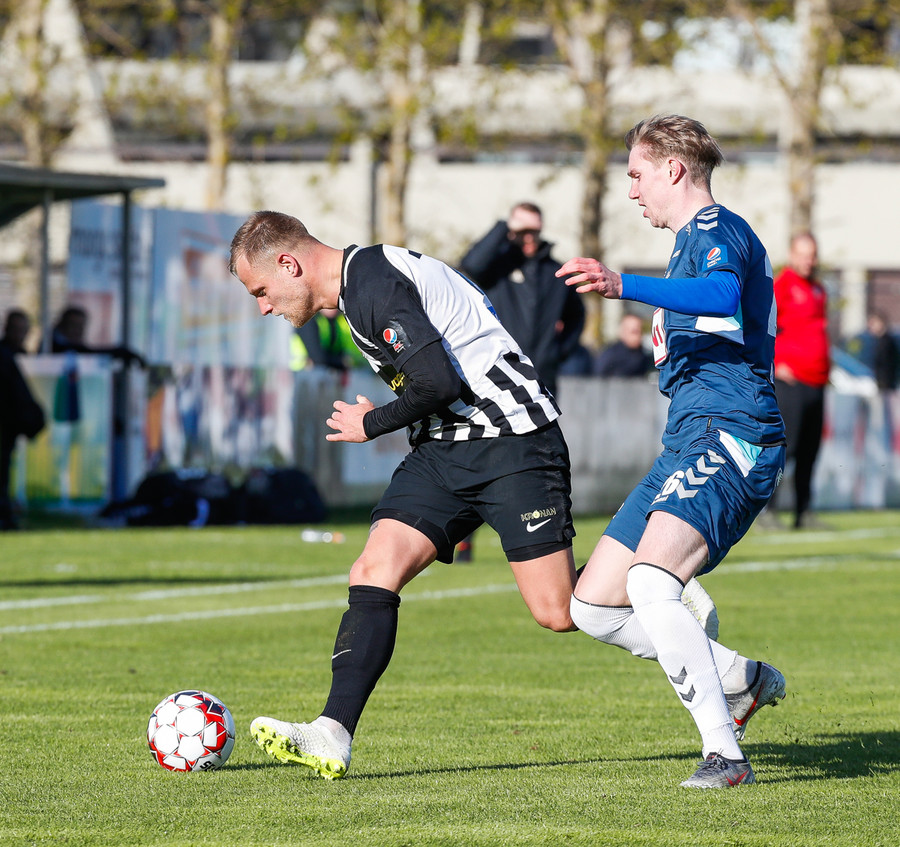 Tobias skallar hér boltann innfyrir á Ægi Jarl en hann skýtur beint í Gilson Correia og útaf í innkast.
