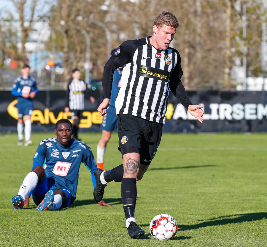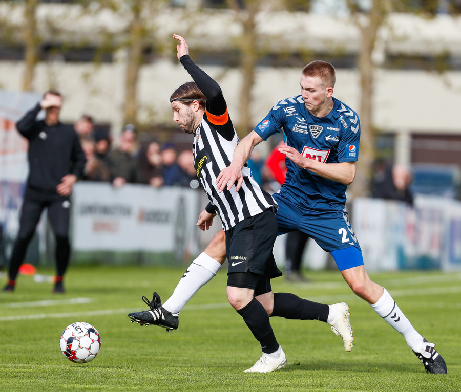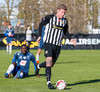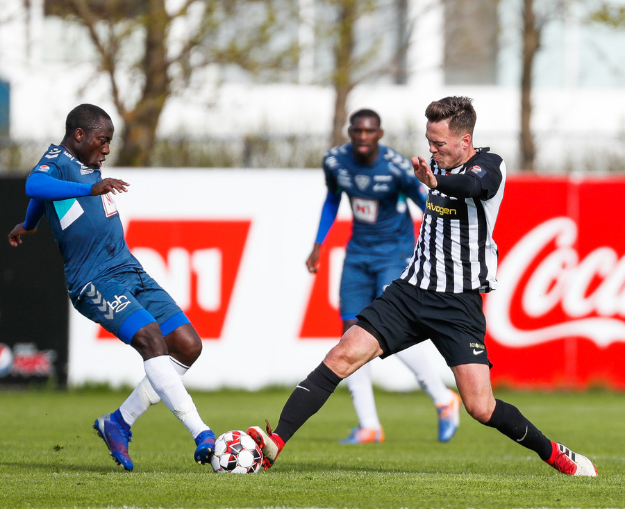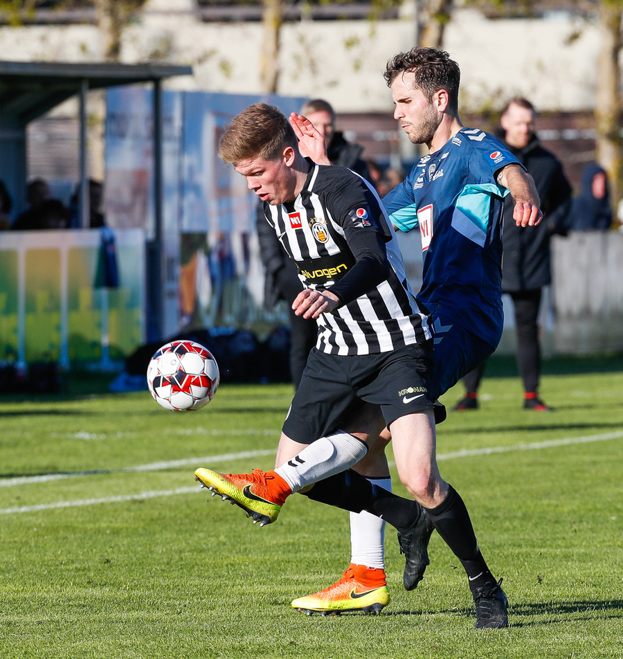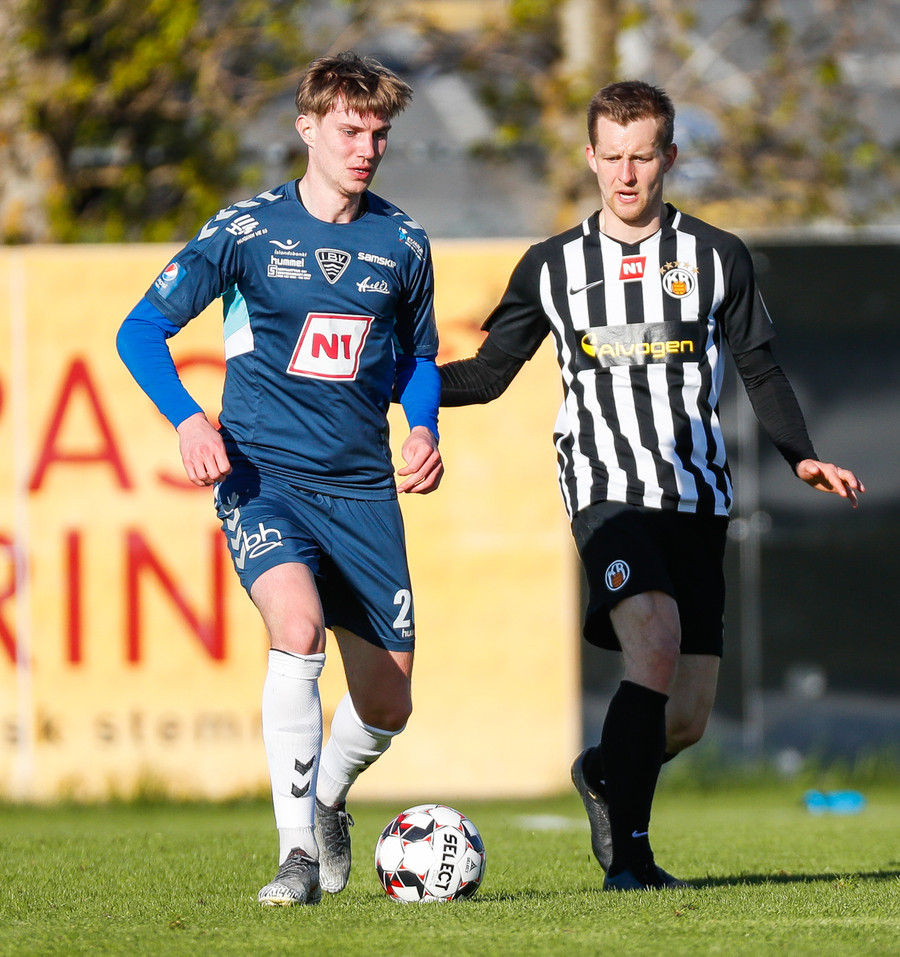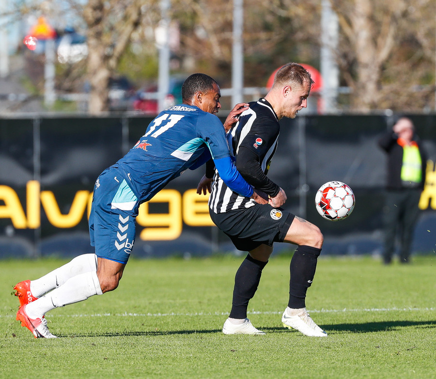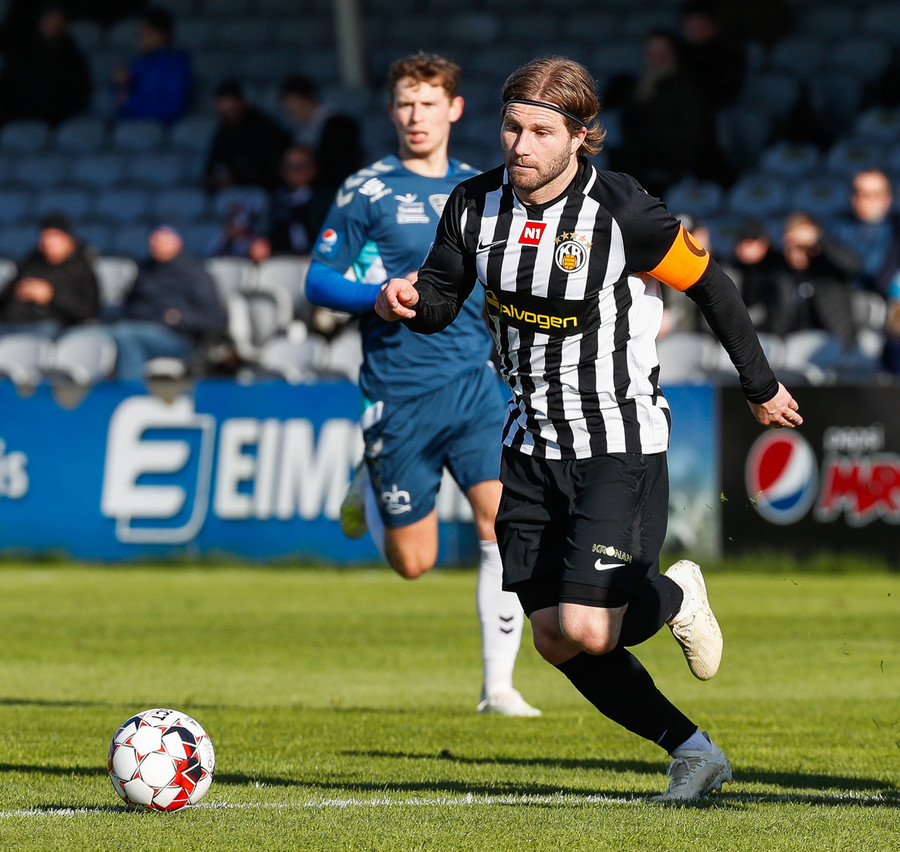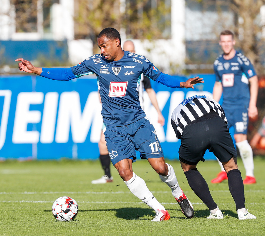 Tobias skallar hér boltann innfyrir á Ægi Jarl en hann skýtur beint í Gilson Correia og útaf í innkast.