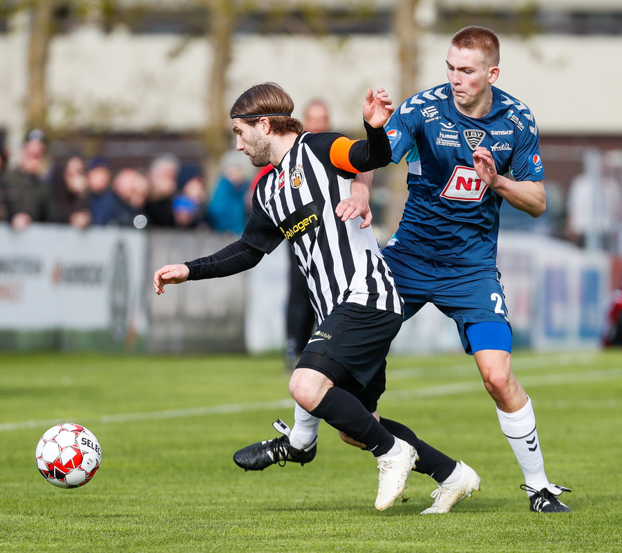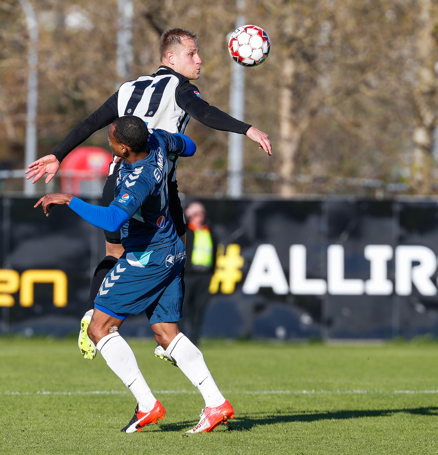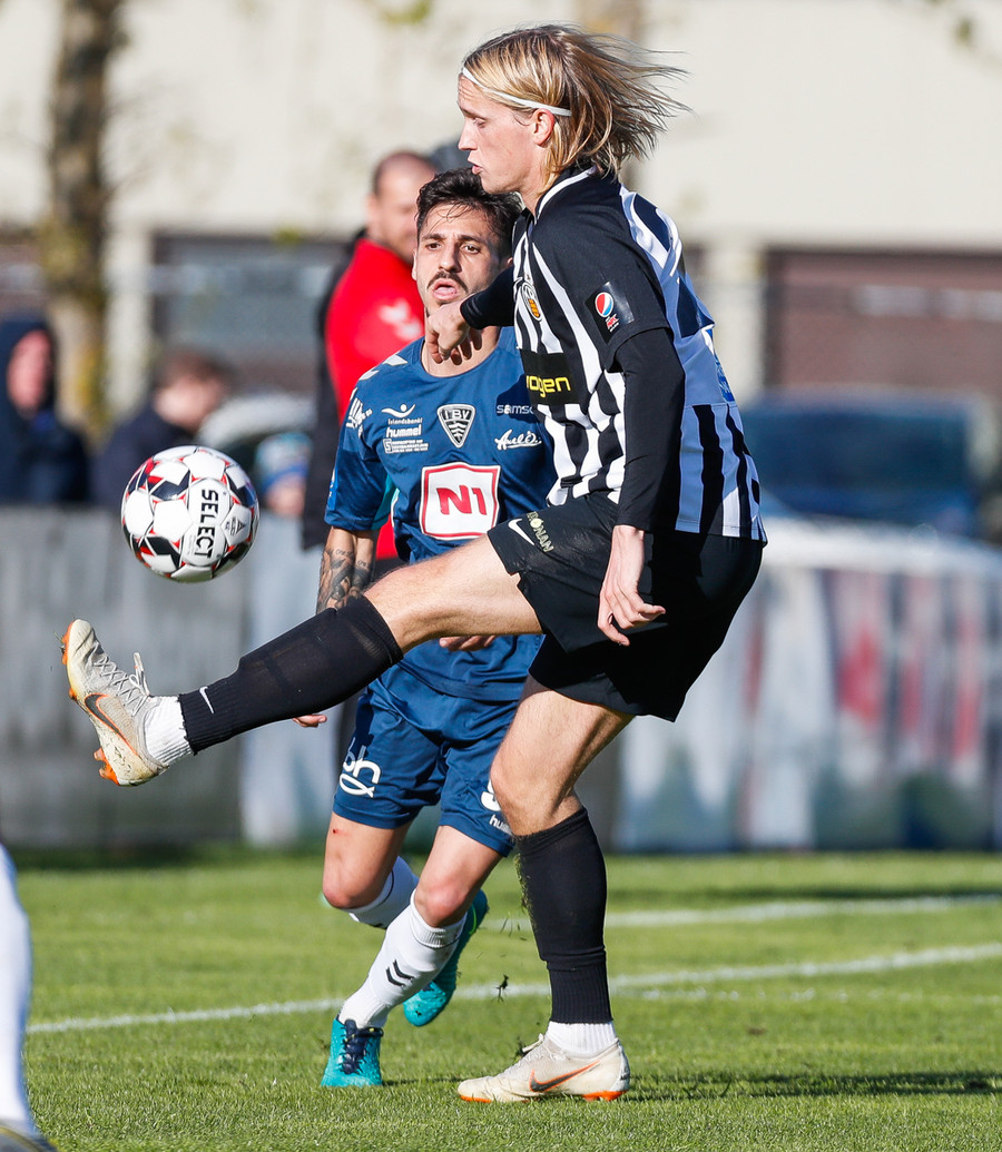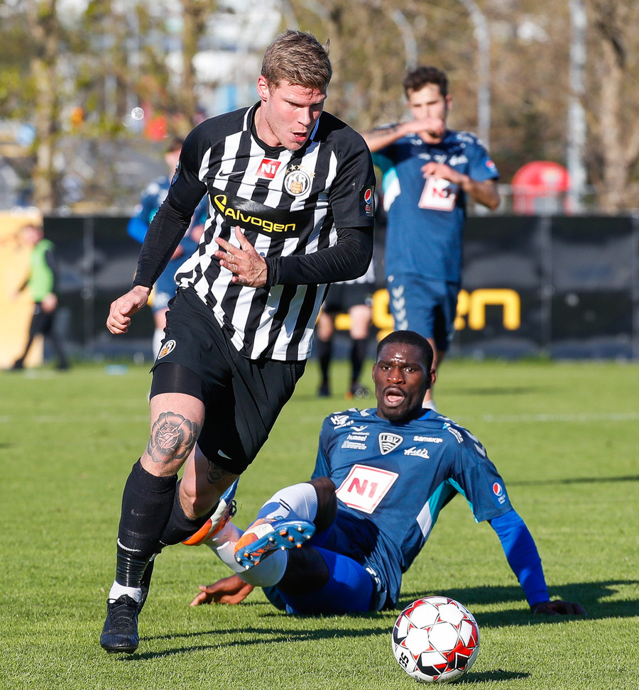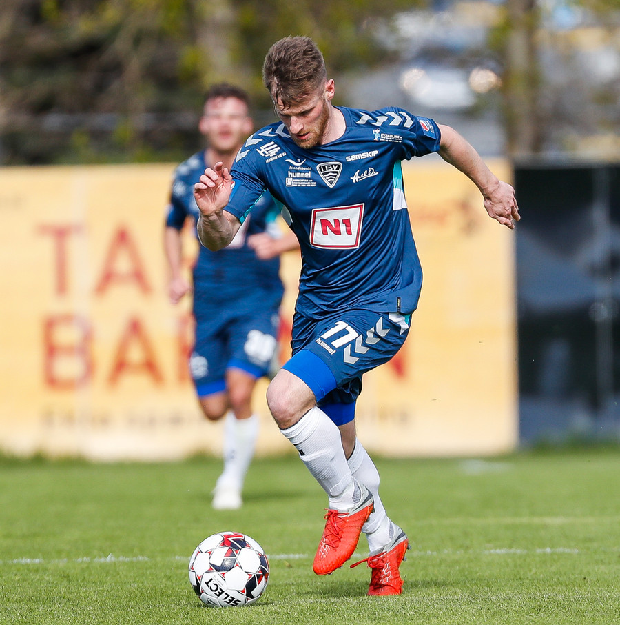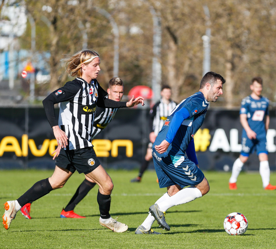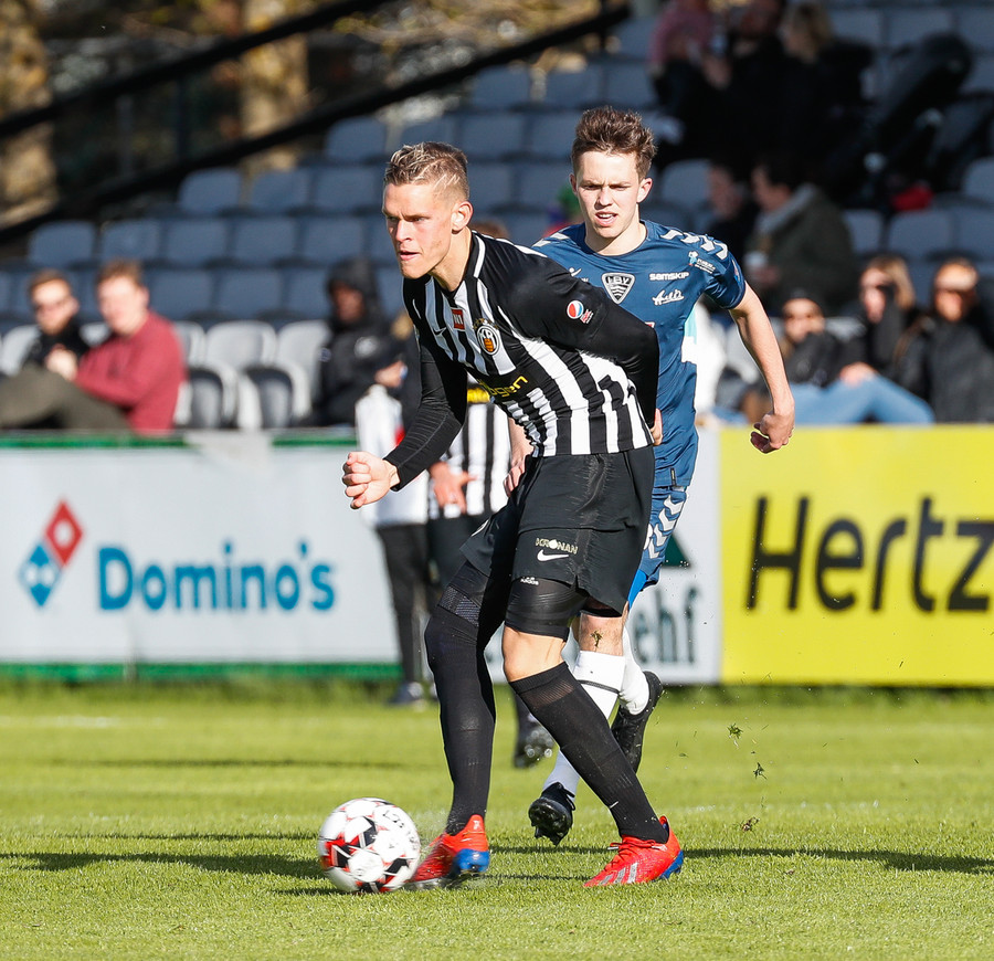 Tobias skallar hér boltann innfyrir á Ægi Jarl en hann skýtur beint í Gilson Correia og útaf í innkast.