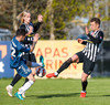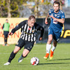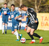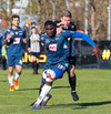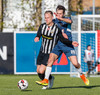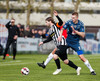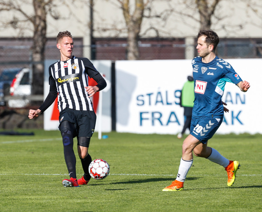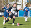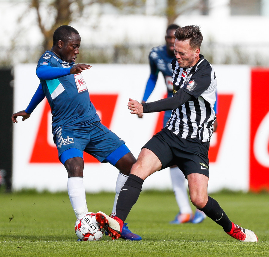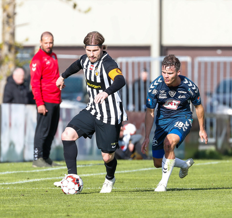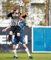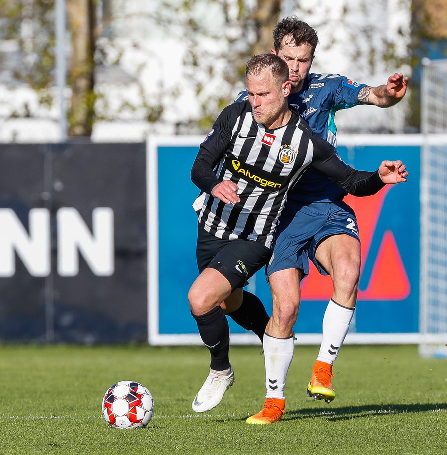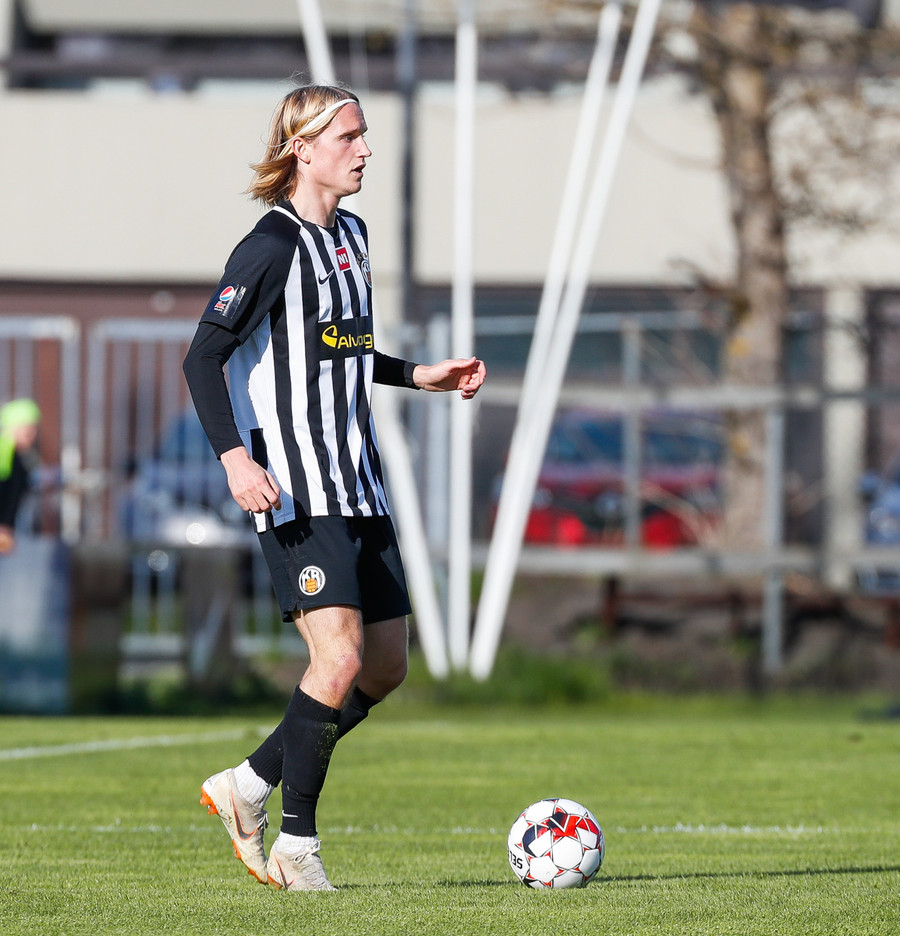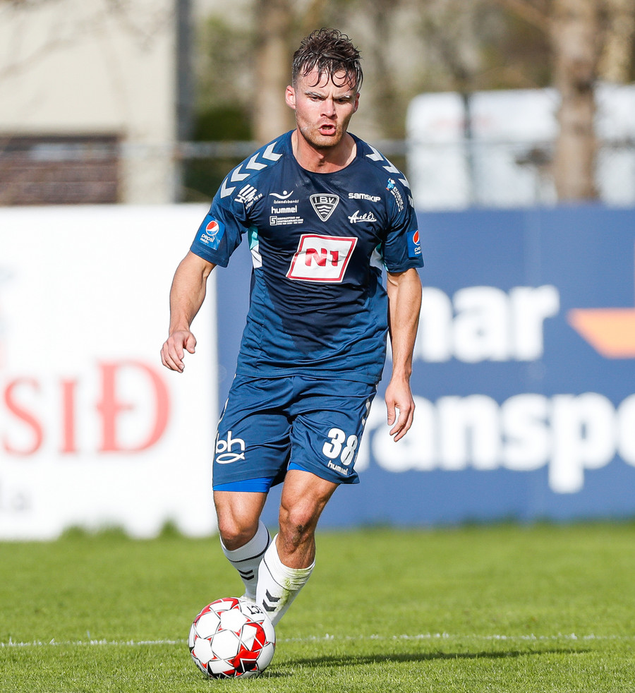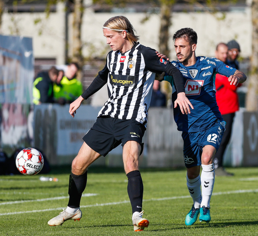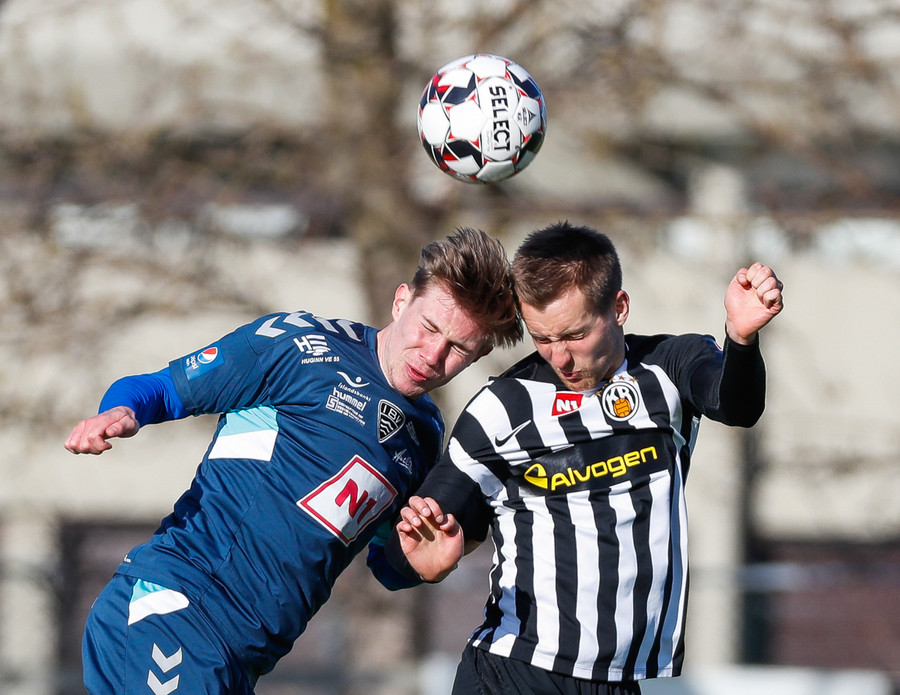 Tobias skallar hér boltann innfyrir á Ægi Jarl en hann skýtur beint í Gilson Correia og útaf í innkast.