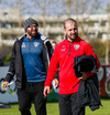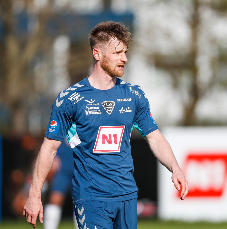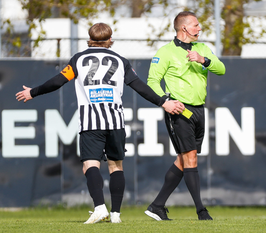 Arnþór Ingi brýtur hér á Jonathan Franks rétt fyrir utan teig. Nafni hans Glenn var galopinn vinstra megin við hann.