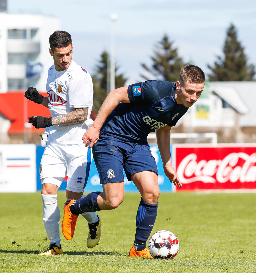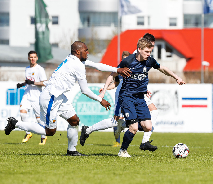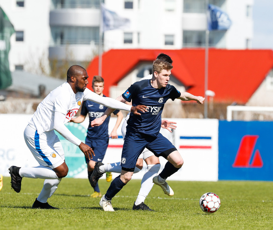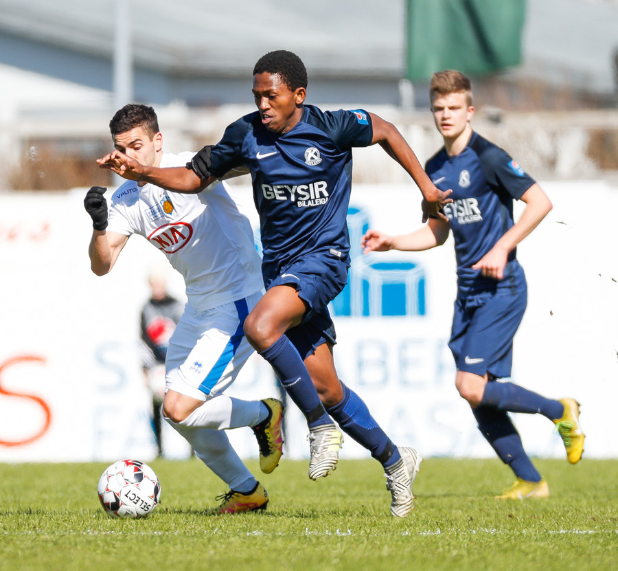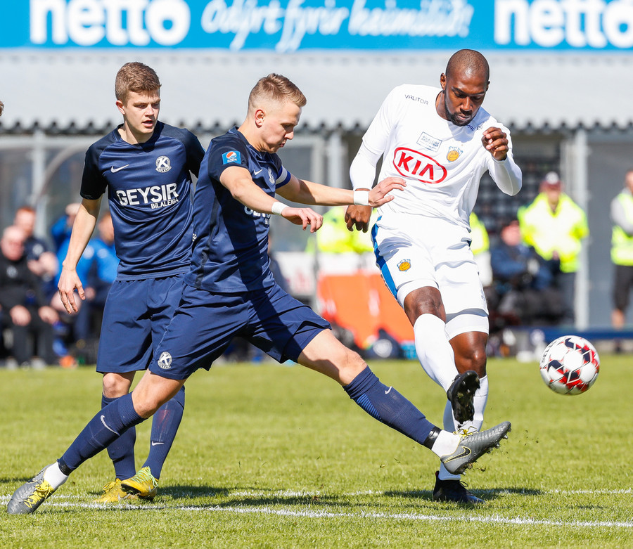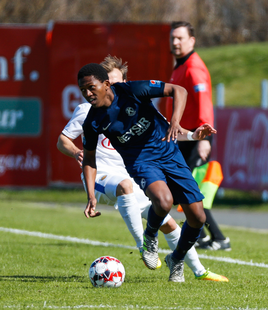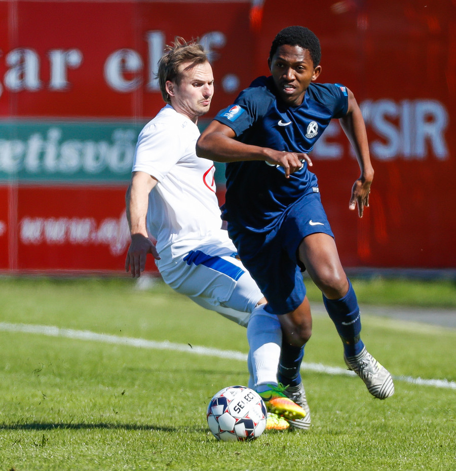 Adolf Bitegeko kemur með sterkan sprett upp hægri kantinn og ætlar sér sov að gefa fyrir en stúkan tók "æjiiii" svo léleg var sú sending.