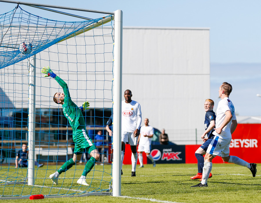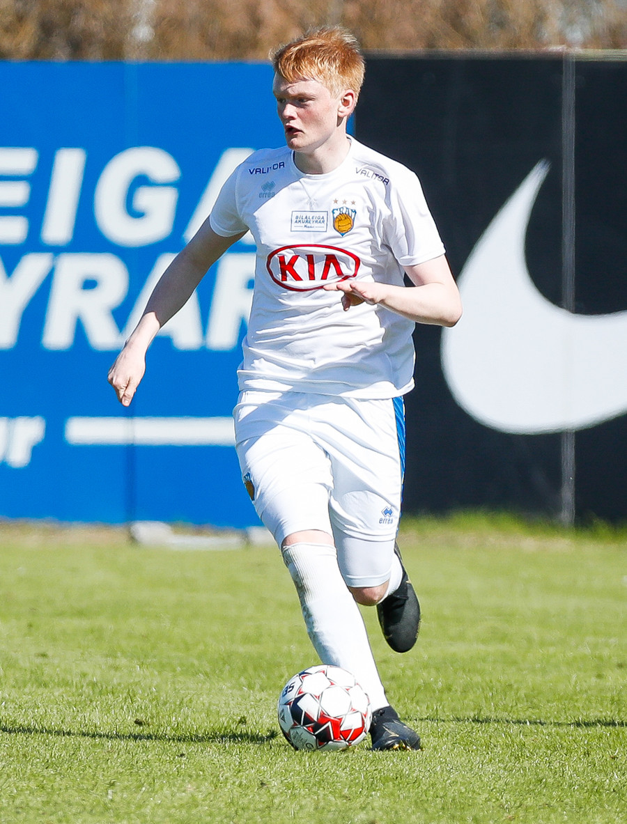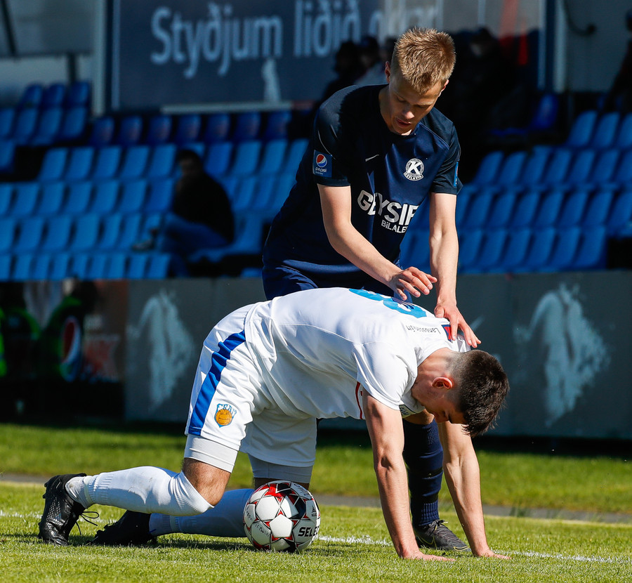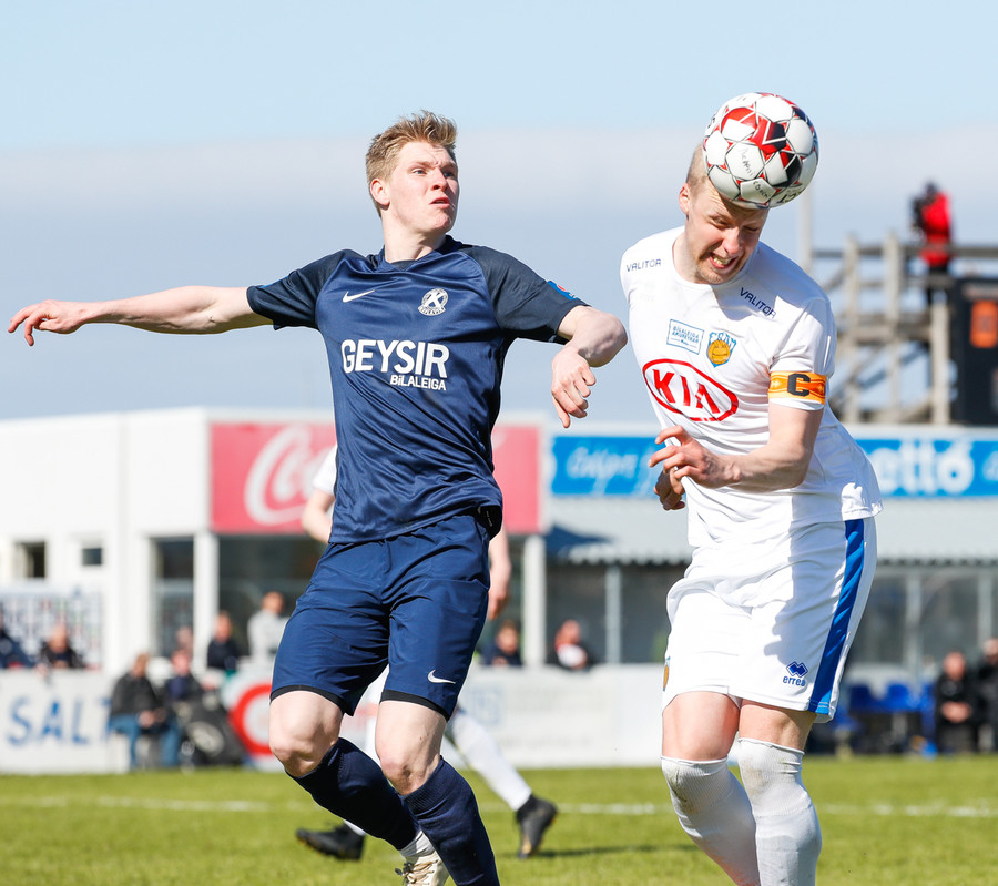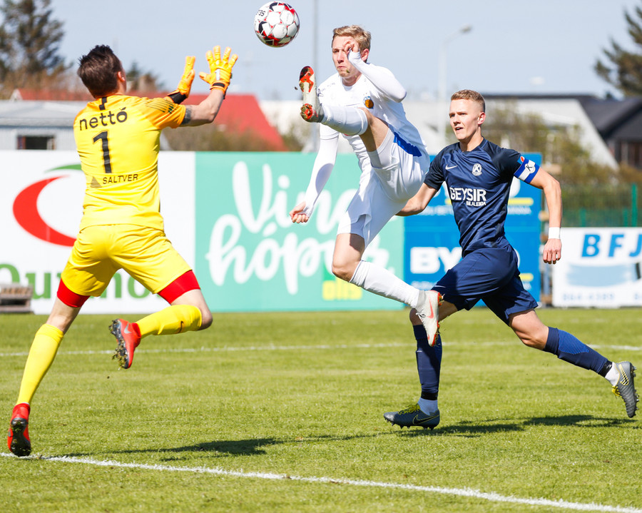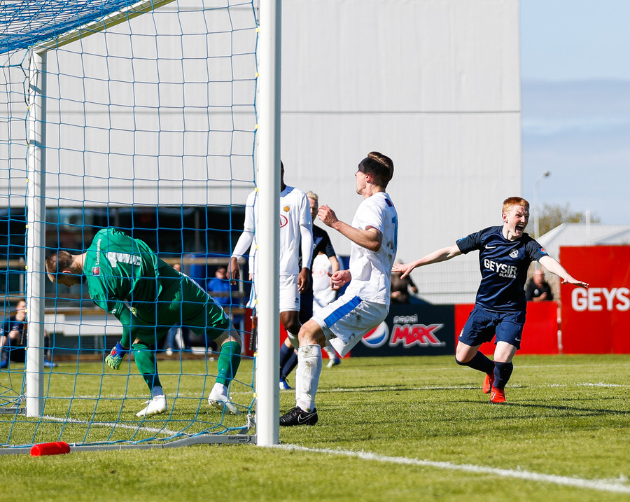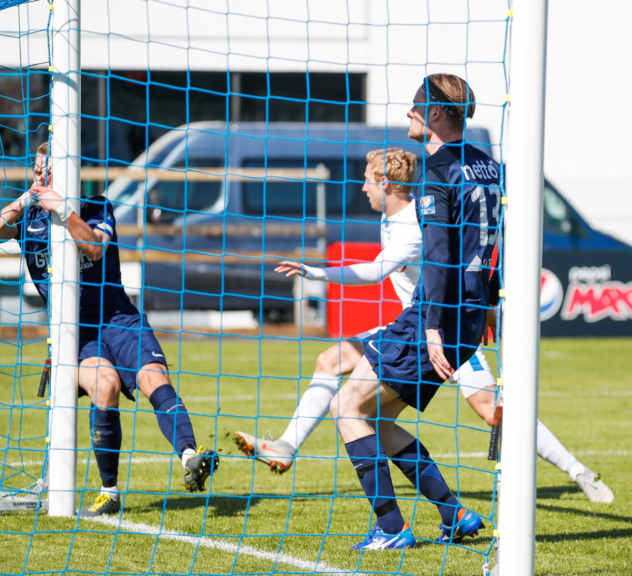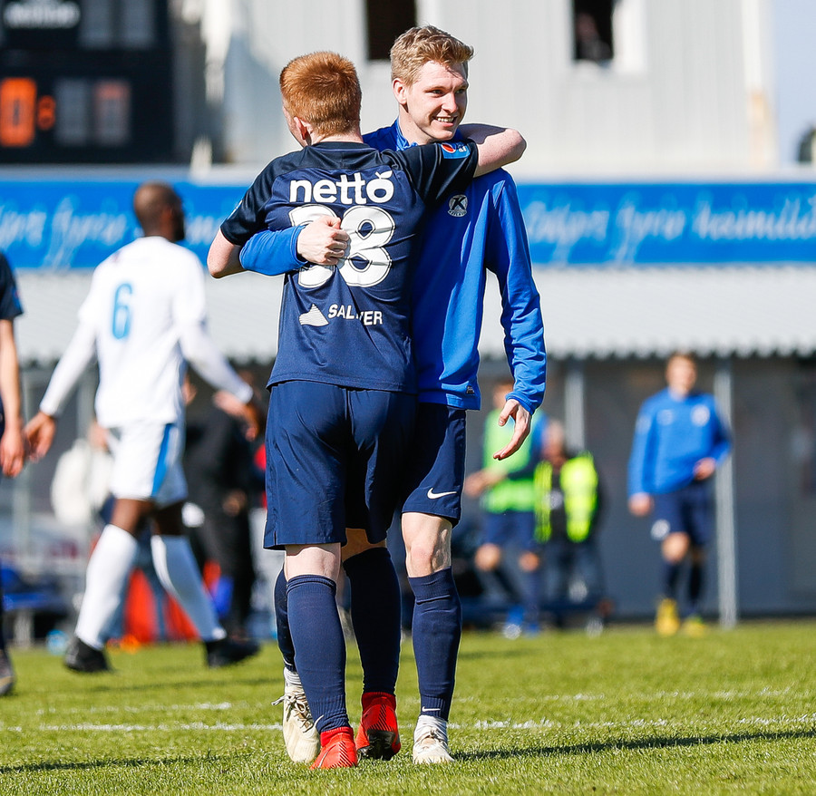 Hvað í.....? Það kemur góður bolti inn á teig mér sýnist Adolf ná skallanum en í samherja og það fer boltinn á Ólaf í markinu!
