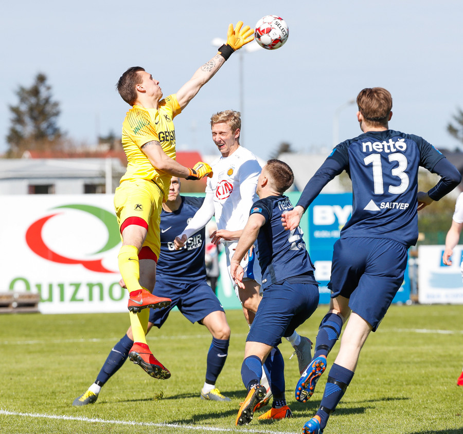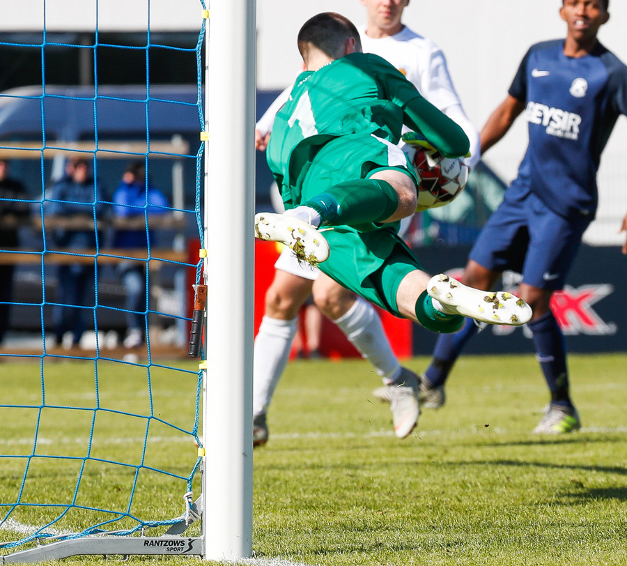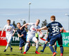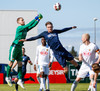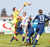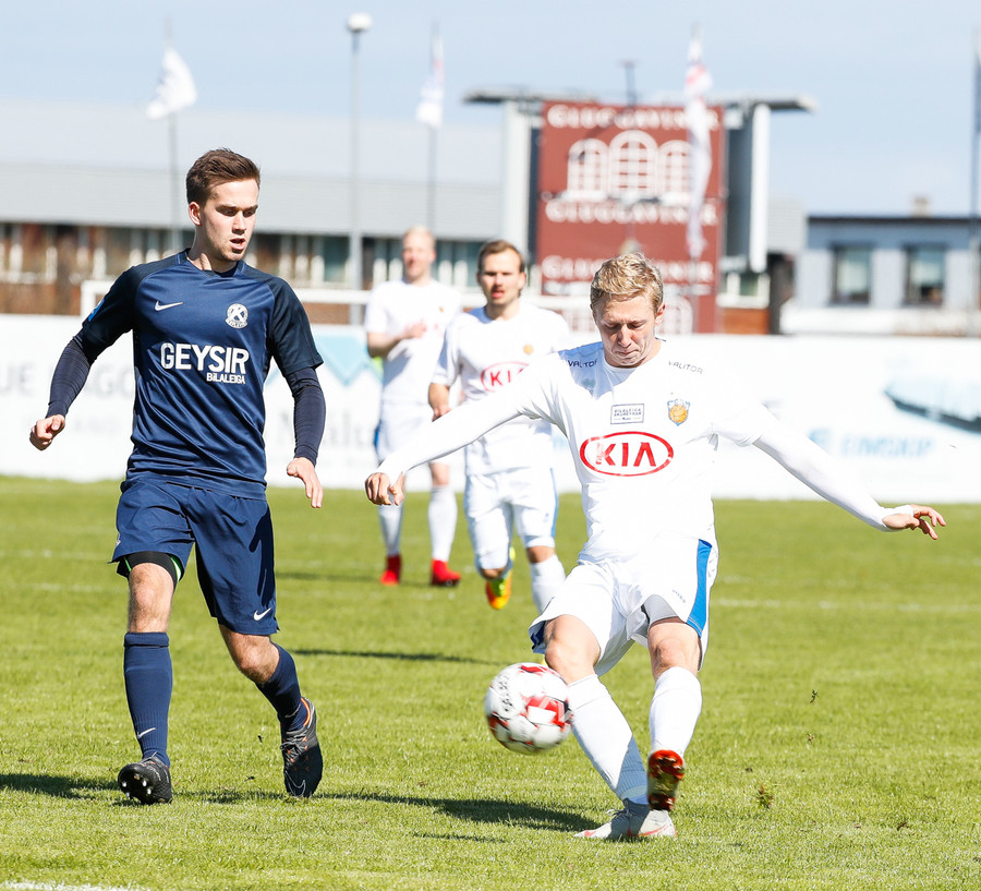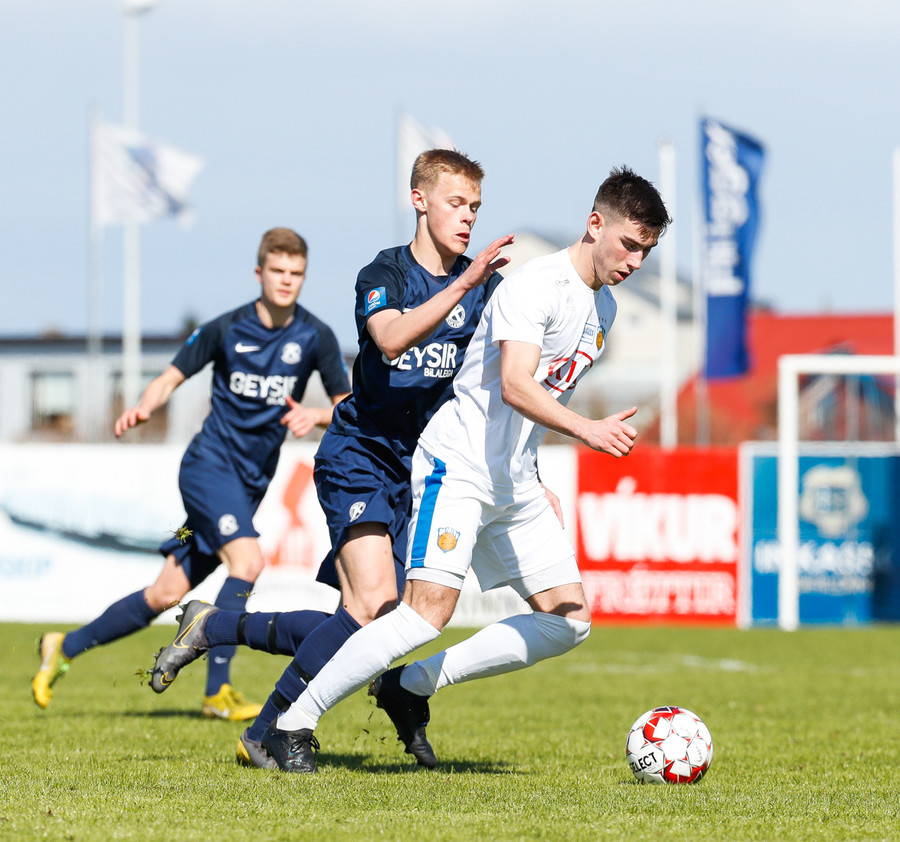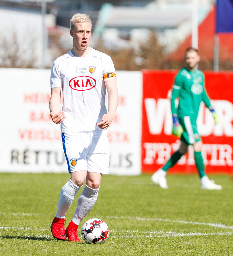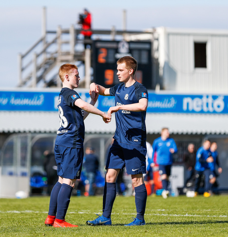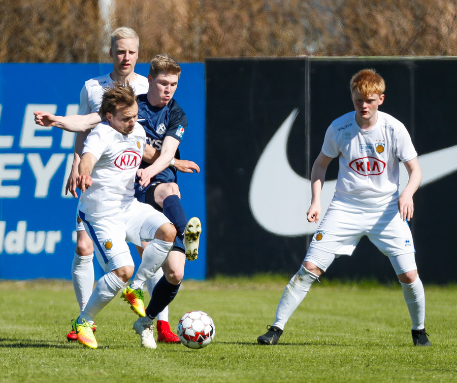 Hvað í.....? Það kemur góður bolti inn á teig mér sýnist Adolf ná skallanum en í samherja og það fer boltinn á Ólaf í markinu!