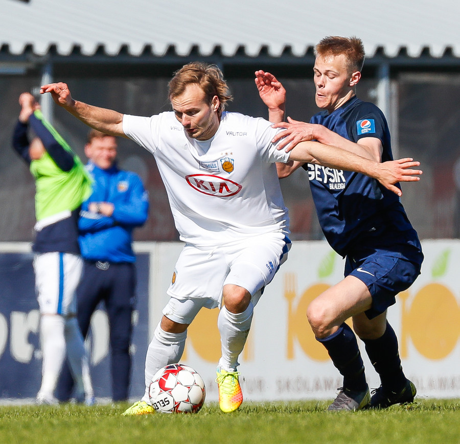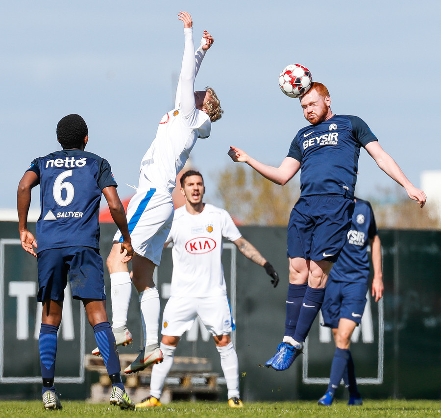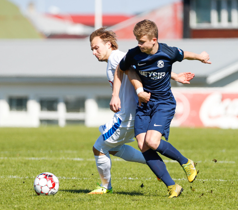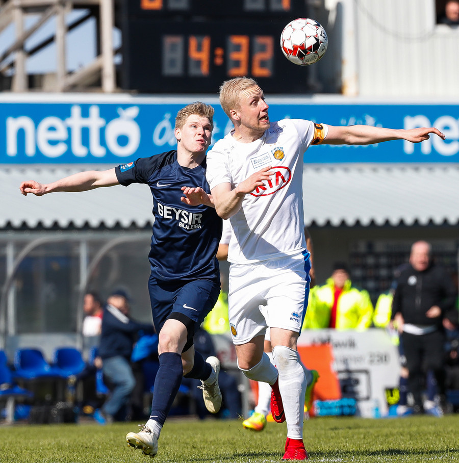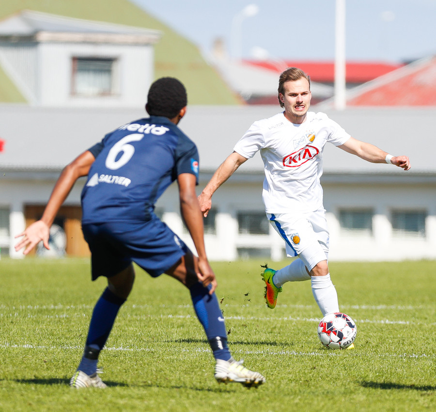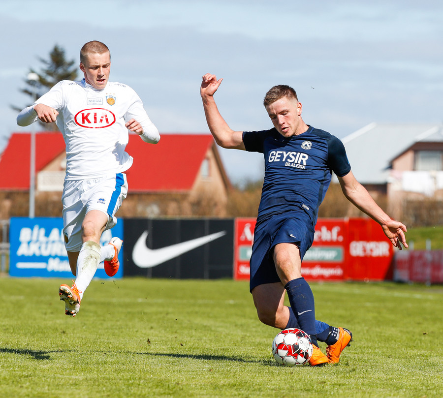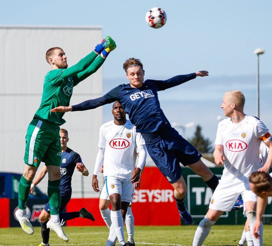 Frábær pressa hjá Tómasi og uppsker innkast út frá því sem Rúnar Þór ætlar að kasta langt inn á teiginn. Það skapast mikil hætta í teignum en gestirnir ná að hreinsa að lokum.