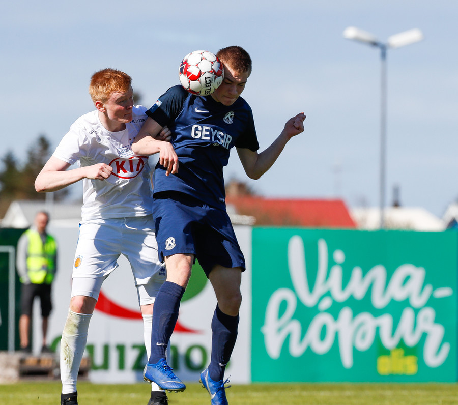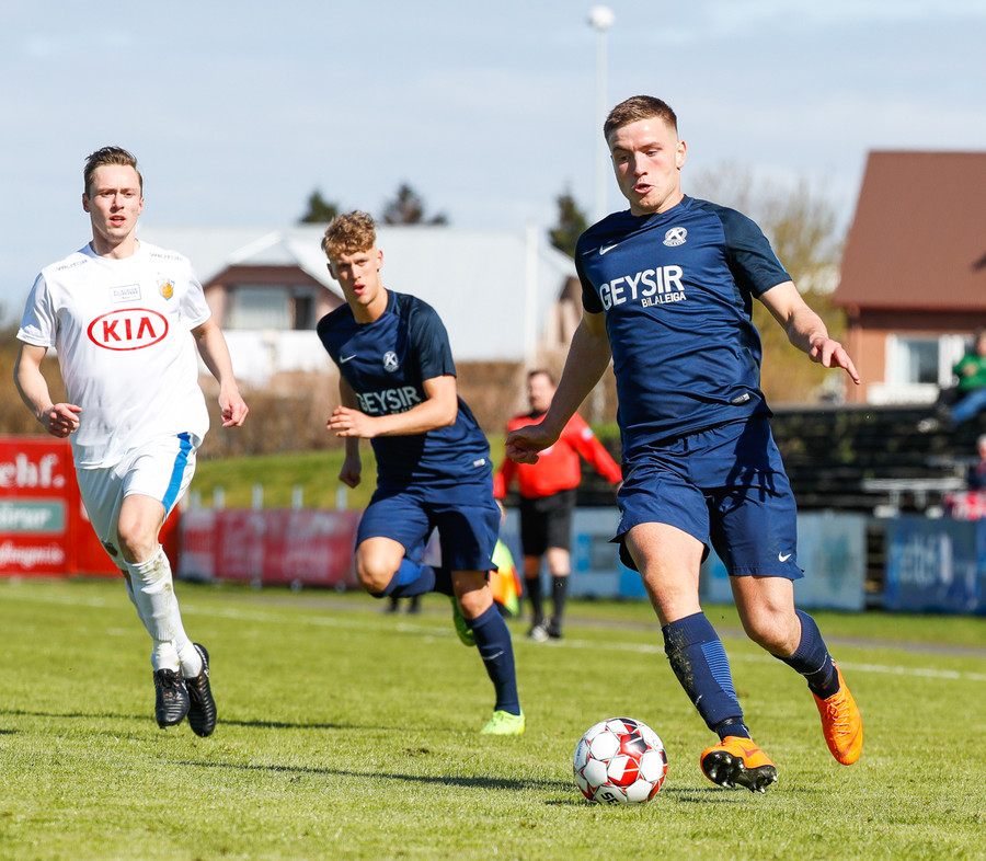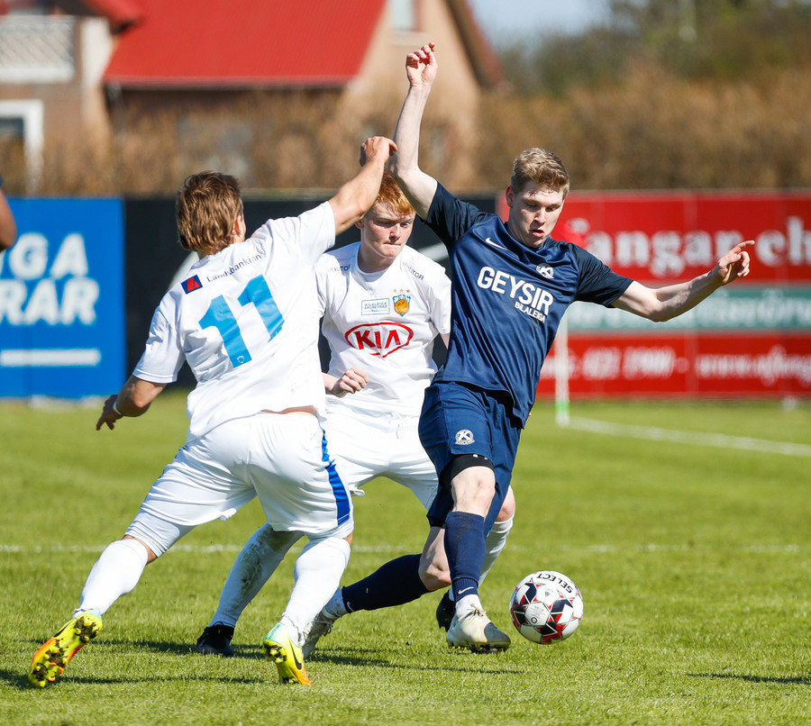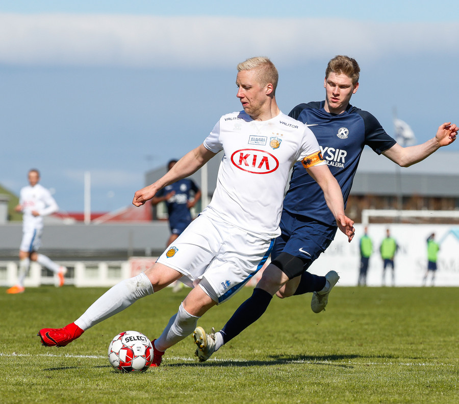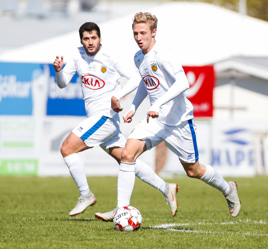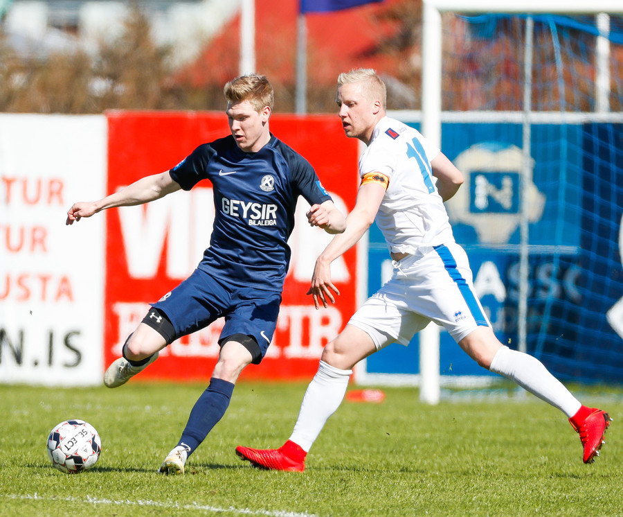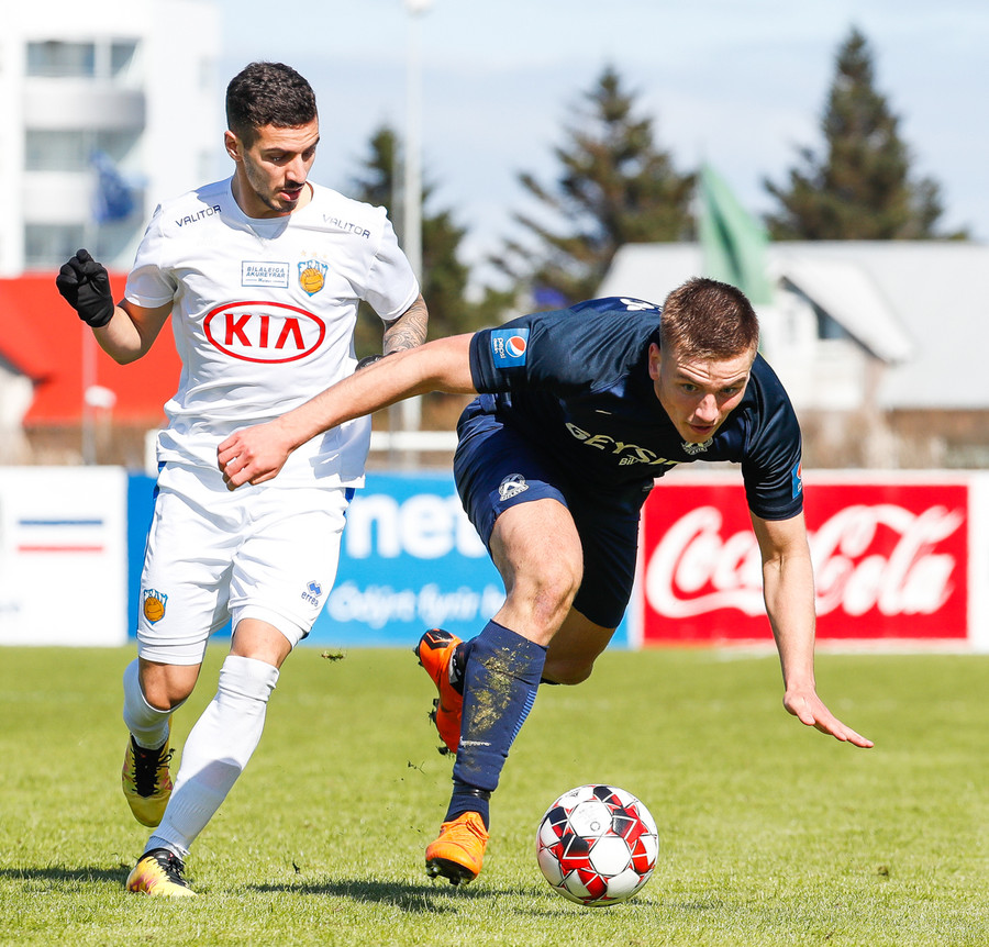 Frábær pressa hjá Tómasi og uppsker innkast út frá því sem Rúnar Þór ætlar að kasta langt inn á teiginn. Það skapast mikil hætta í teignum en gestirnir ná að hreinsa að lokum.