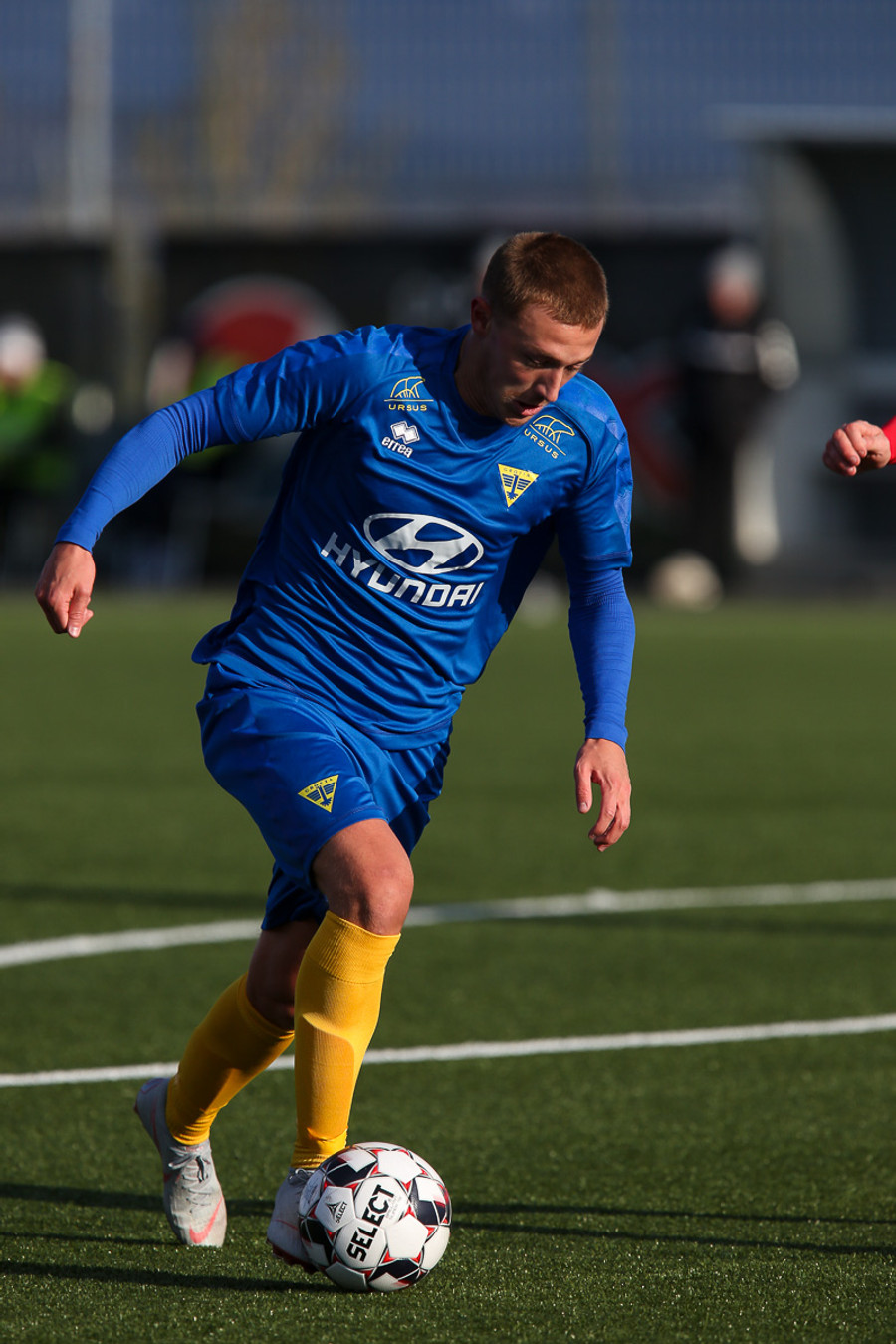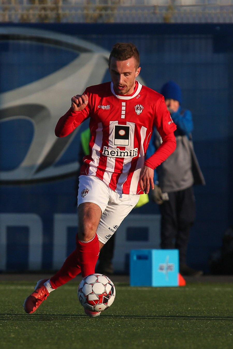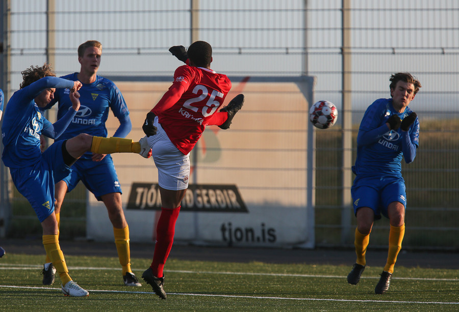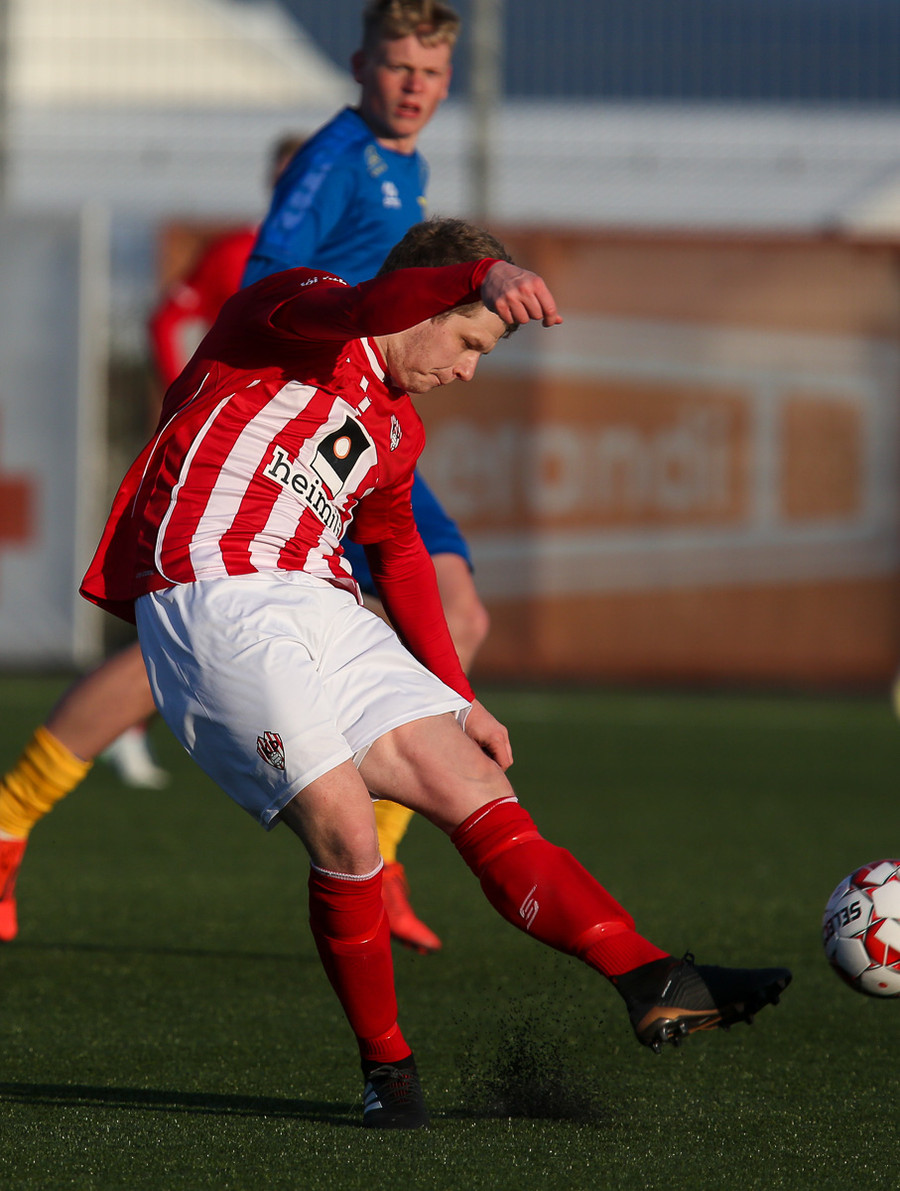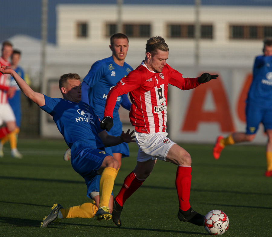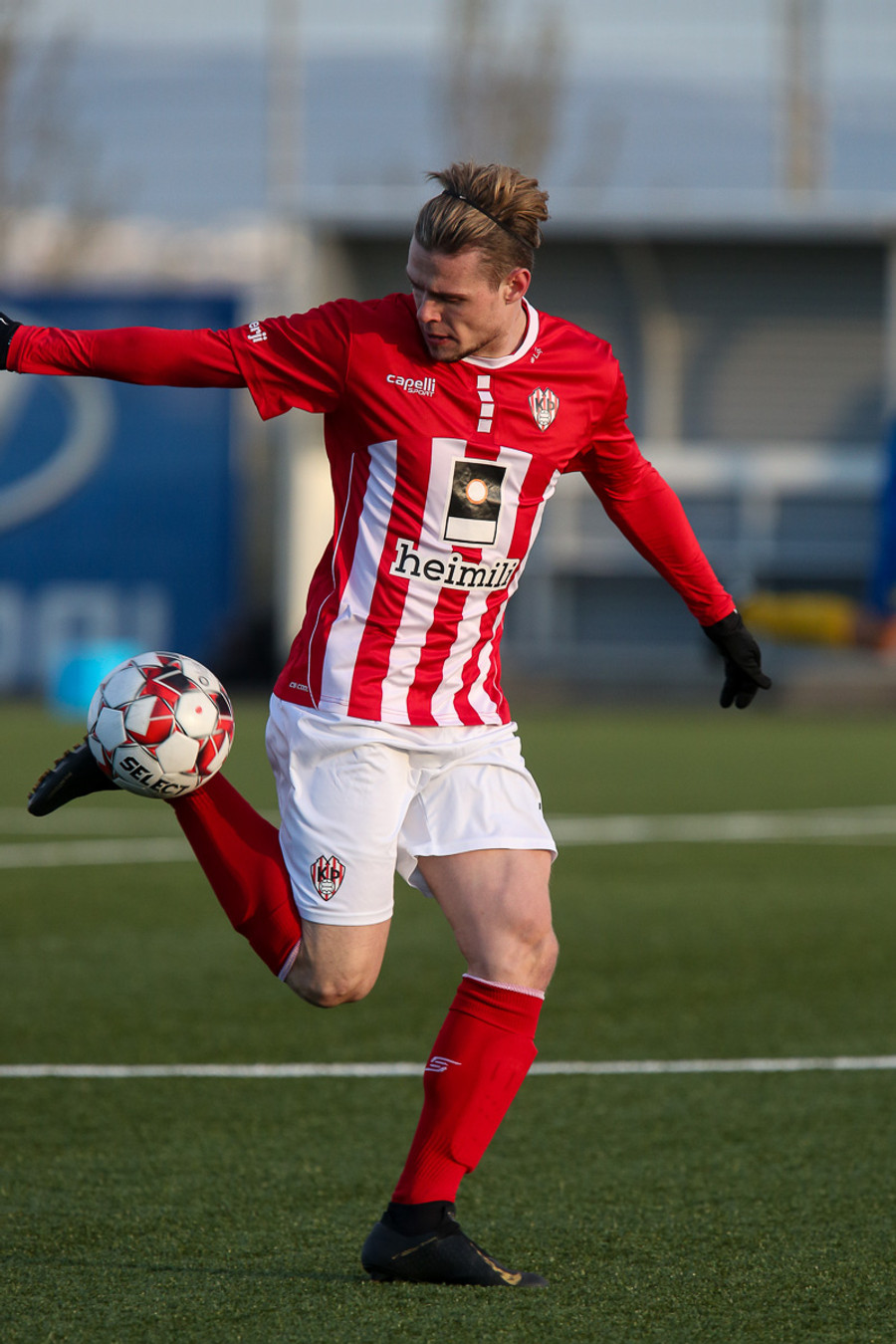 Birkir Þór rekur boltan upp miðjuna. Gefur hann síðan á Aron Þórð sem skýtur að marki en Hákon ver.