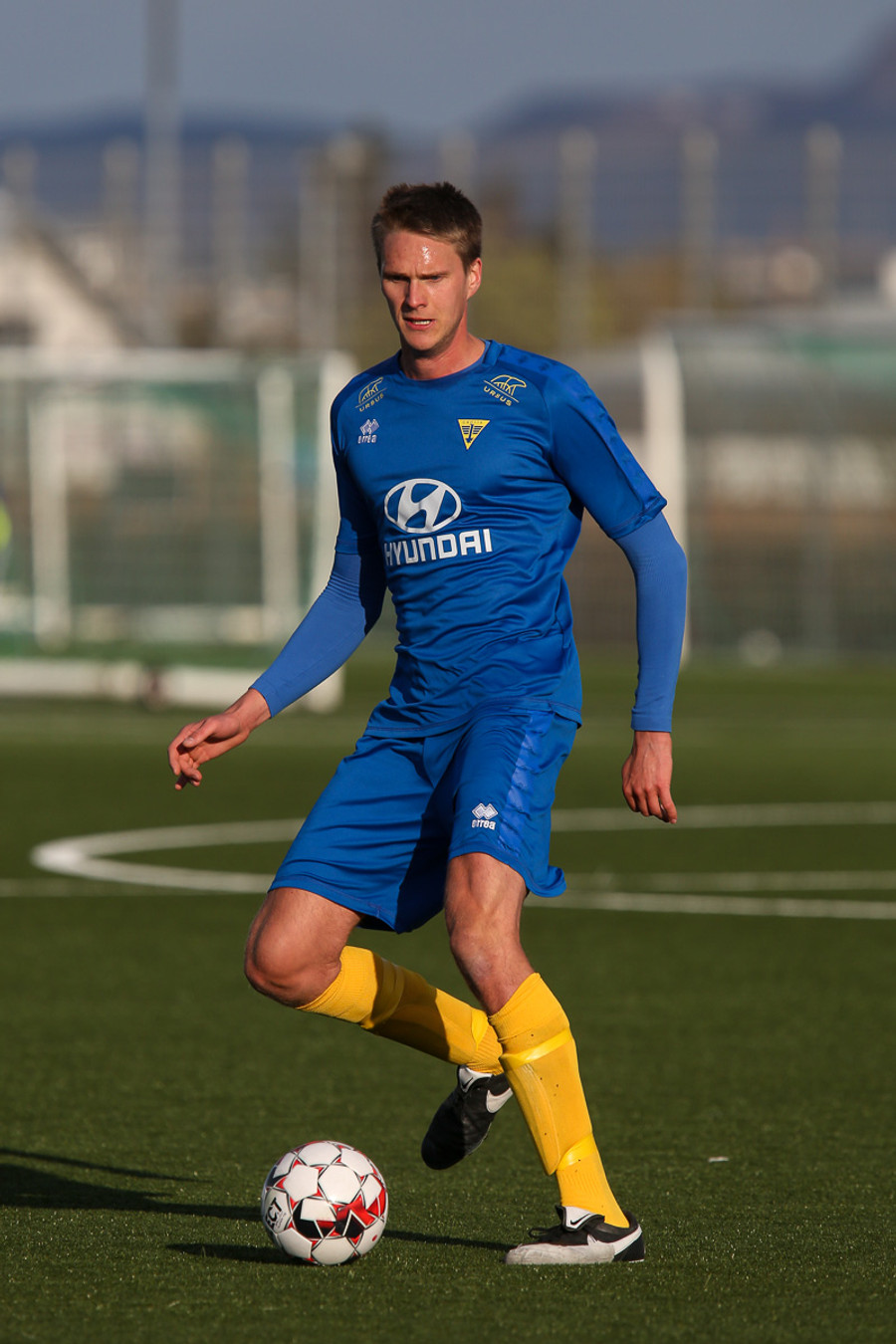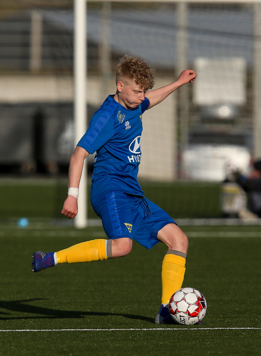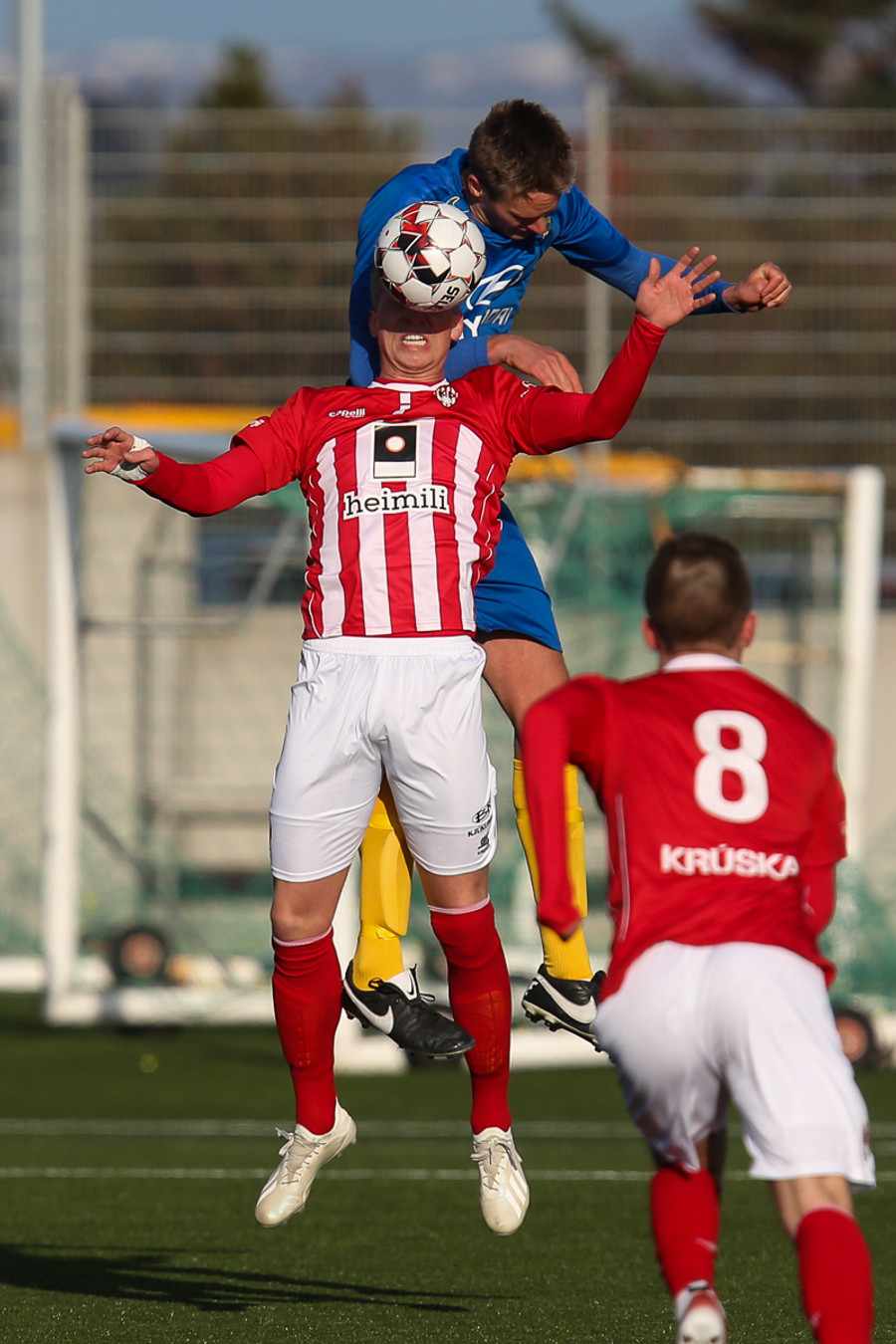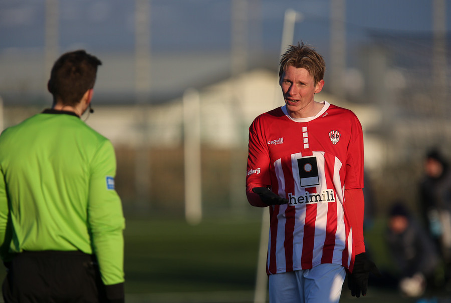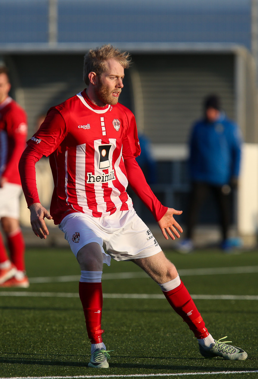 Birkir Þór rekur boltan upp miðjuna. Gefur hann síðan á Aron Þórð sem skýtur að marki en Hákon ver.