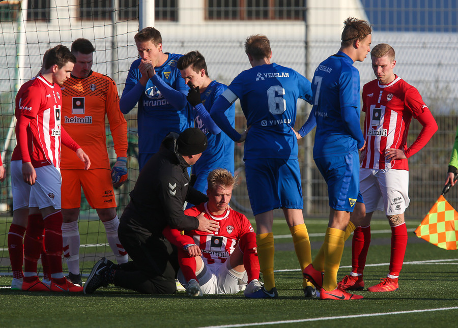 Þrótttarar voru komnir fjórir á þrjár þegar Axel brýtur á Daða og uppsker gult spjald.