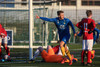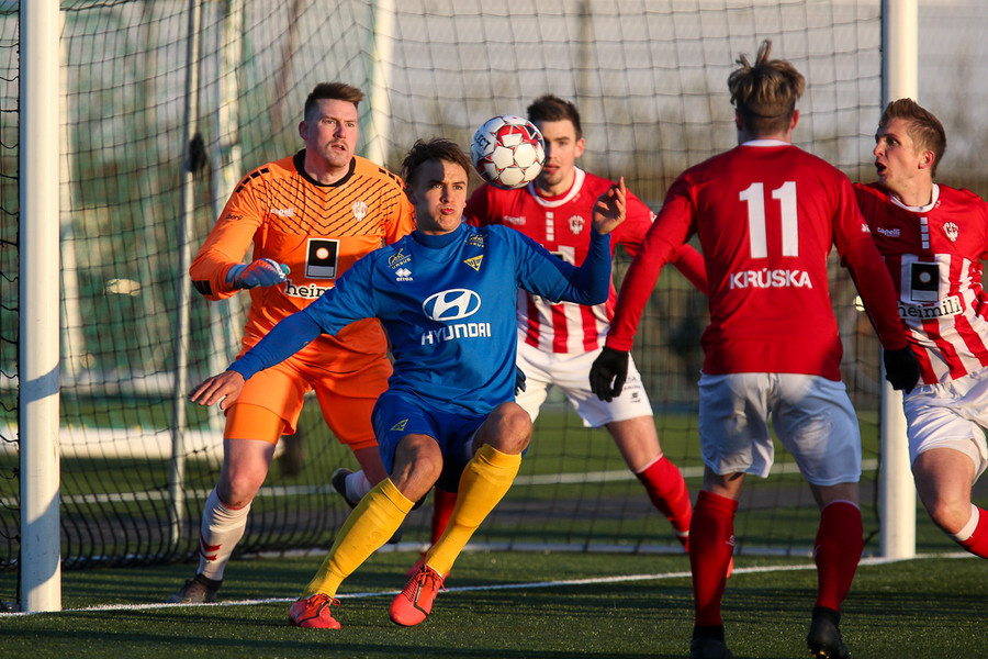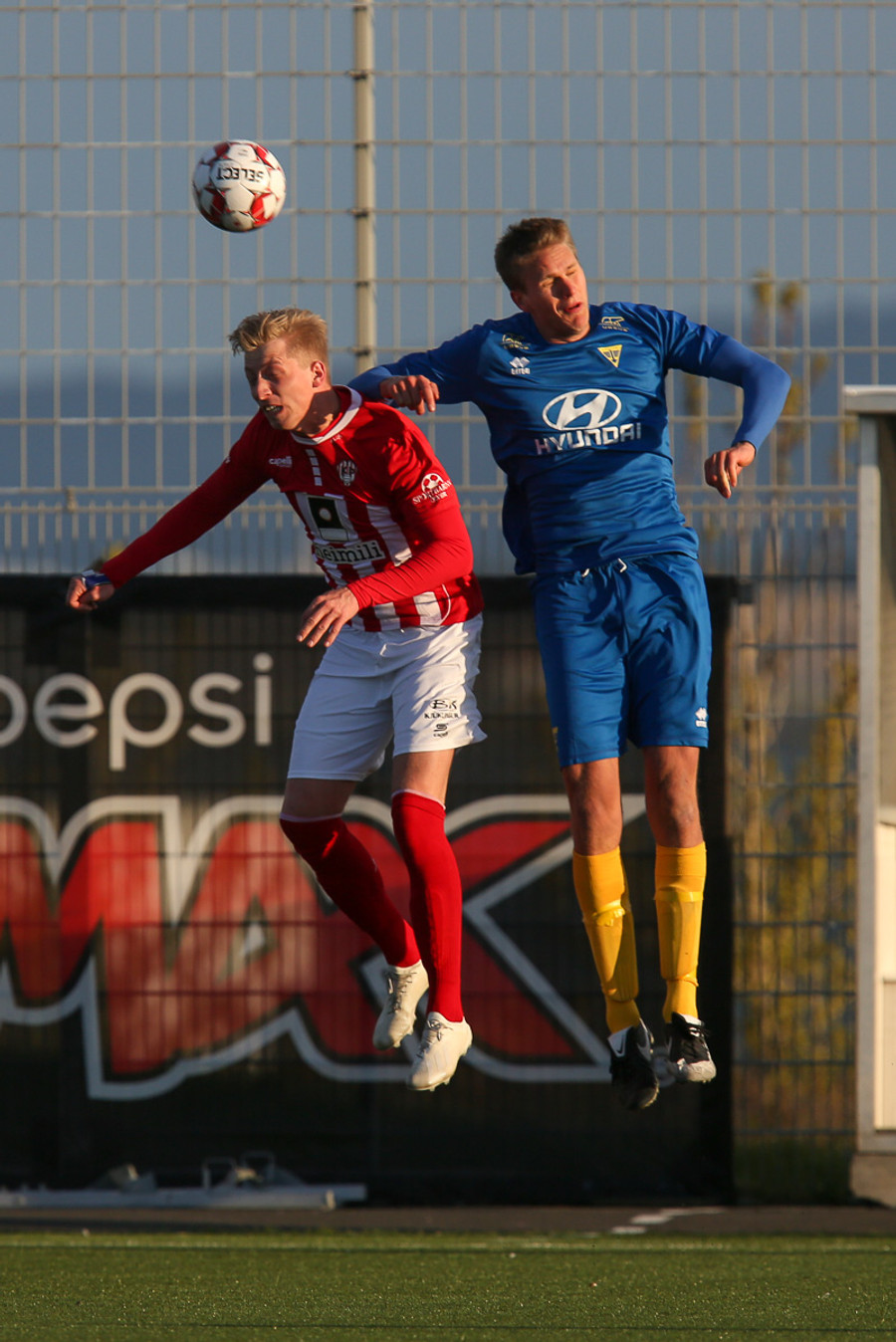Arnar Þór stígur fyrir Þróttara rétt hjá hornfána Gróttu. Þróttur fær aukaspyrnu sem Hákon á ekki í vandræðum með að grípa.