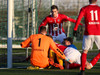 Þróttari liggur niðri í vítateig þeirra eftir að leikmenn raða sér upp fyrir að taka horn. Allt í einu er Arnar Darri brjálaður og allir leikmenn leiksins eru að ýta hvor öðrum inn í markinu. Dómarinn hleypur að markinu og róar þá niður.
