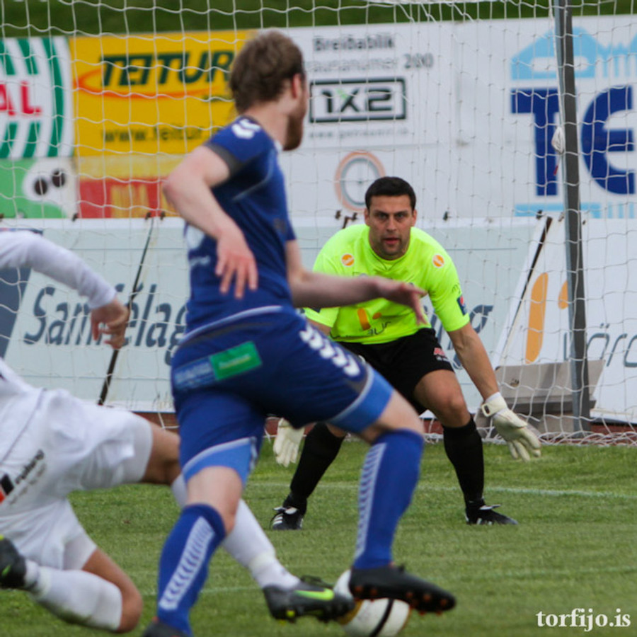 Blikar komnir yfir. Vítaspyrna dæmd eftir að Þórður Ingason, markvörður gestaliðsins, braut á Petar Rnkovic. Ekkert spjald á Þórð þar sem Rnkovic var á leið frá markinu. Hann fór sjálfur á punktinn, sendi Þórð í rangt horn og skoraði af öryggi.