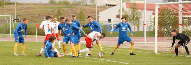 Hér átti Sveinn Elías að gera miklu miklu miklu betur og hann veit það sjálfur. Kominn inn í teig Gróttu og í stað þess að senda boltann á annað hvort Alvaro eða Jóhann Helga sem voru báðir vel staðsettir inn í teig ákveður hann að taka skot.