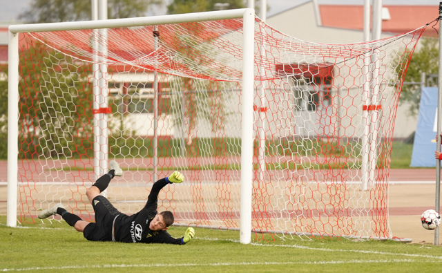 Þá erum við mætt hinum meginn þar sem Pétur Theódór tekur skot fyrir utan teig sem Aron í markinu tekur nokkuð auðveldlega.