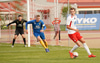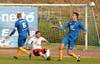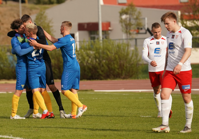 Pétur Thedór nánast sloppinn í gegn eftir langan bolta en Hermann gerir vel í vörninni og kemur hættunni frá.