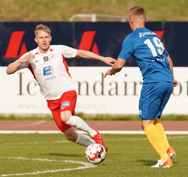 Óliver stoppar skyndiáhlaup í kjölfar hornspyrnunar. Jónas kominn á fulla ferð samt ennþá inn á eigin vallarhelming.