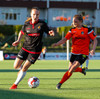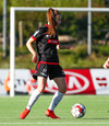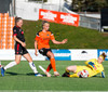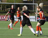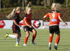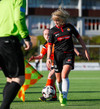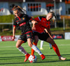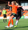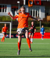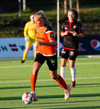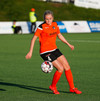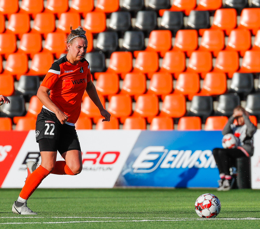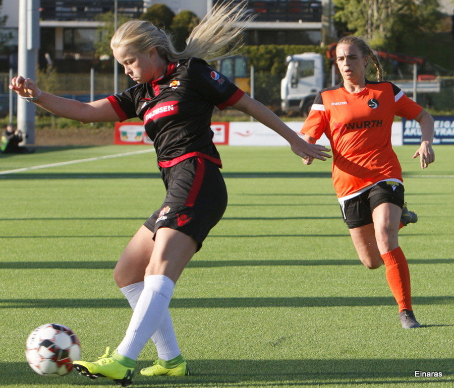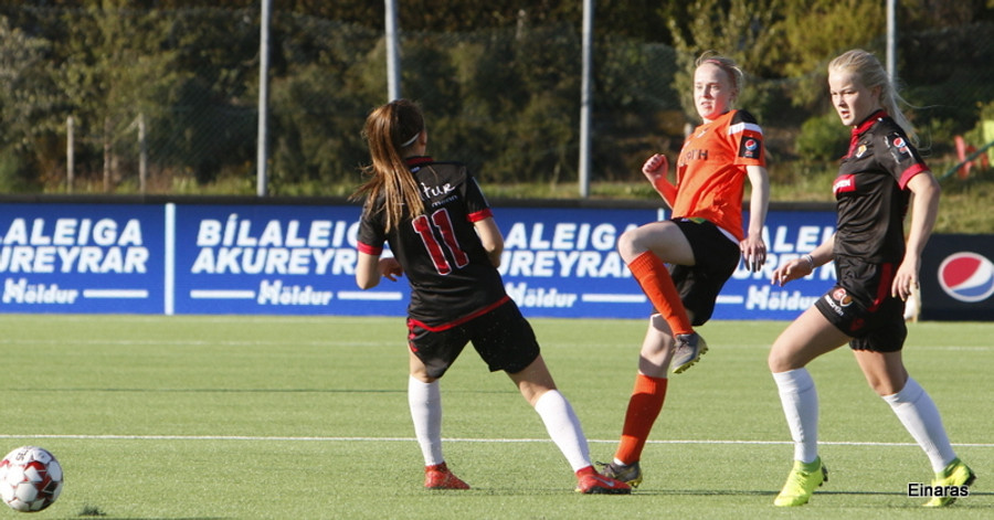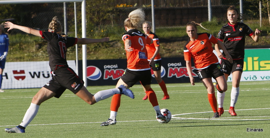 Stefanía Hrund dansar með boltann nálægt endalínunni og skapar sér pláss þrátt fyrir að tveir varnarmenn séu í henni, hún sendir boltann inn í teig en skallinn rétt framhjá.