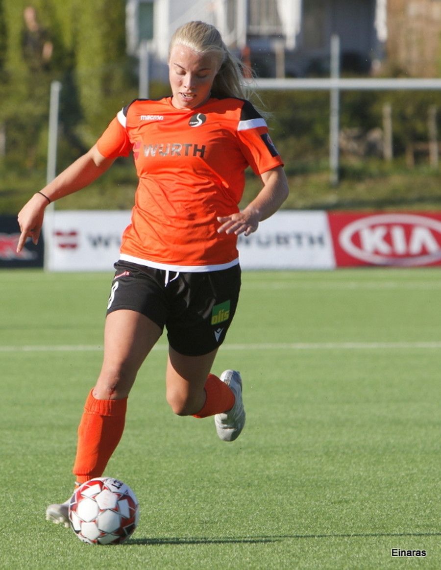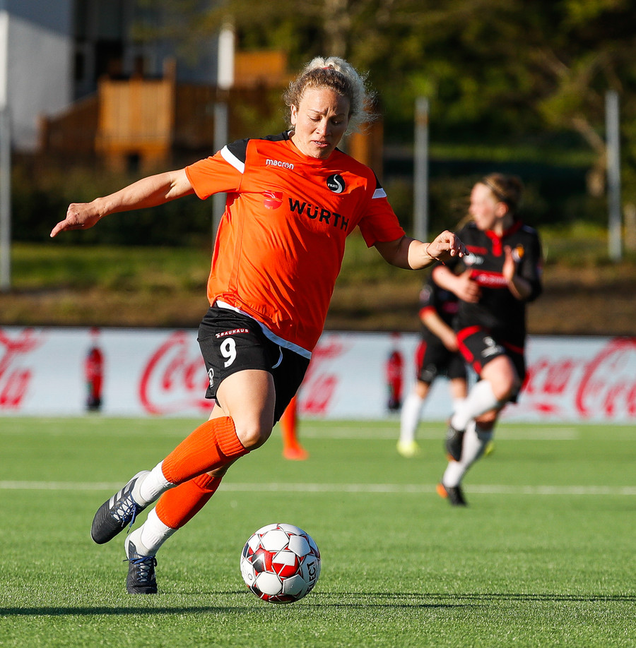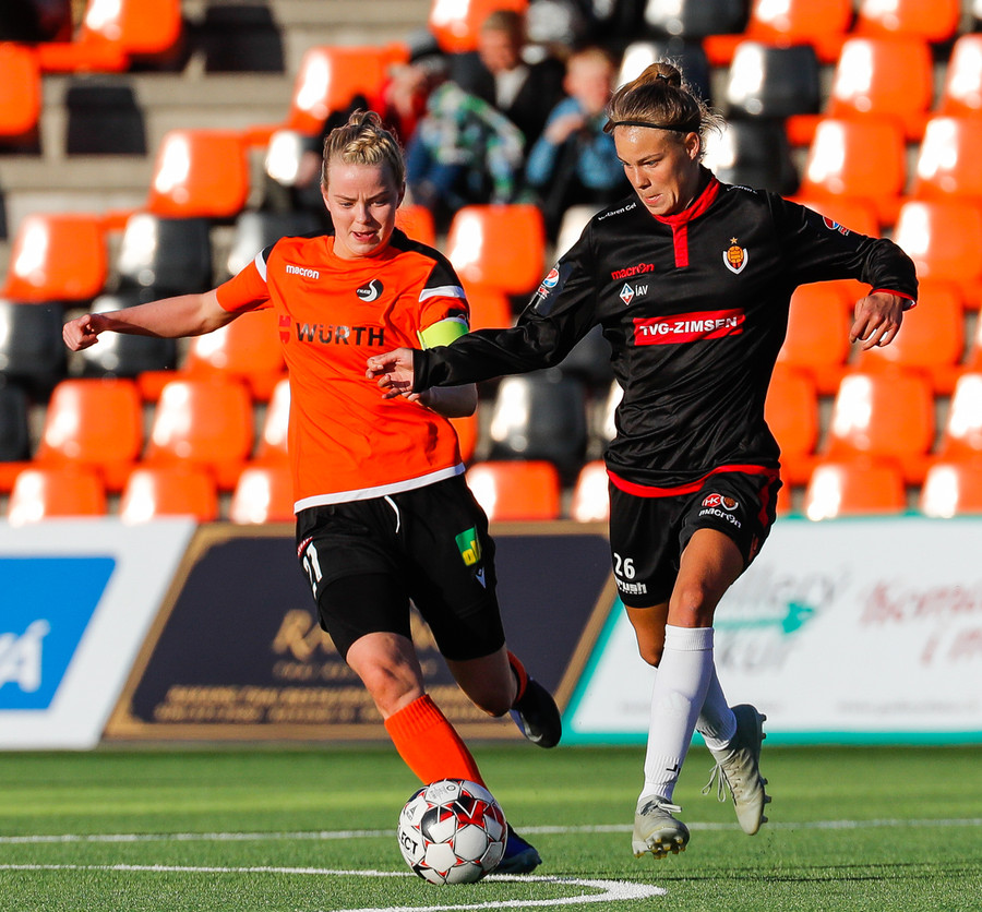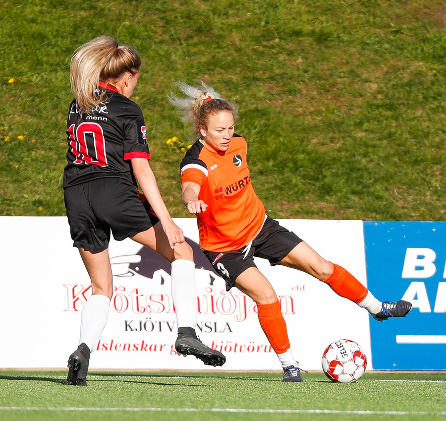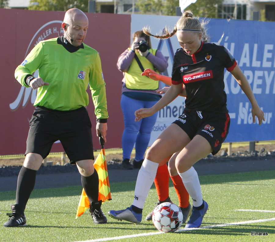Karólína vinnur boltann og reynir að sækja upp kantinn er Berglind Rós eltir hana upp og gerir nóg til að stoppa sendingu og að lokum brýtur Karólína á henni.
