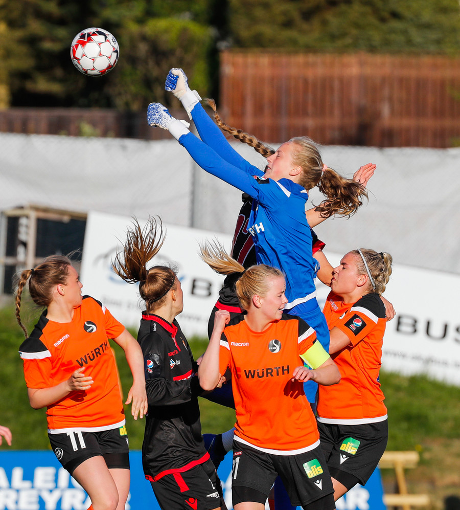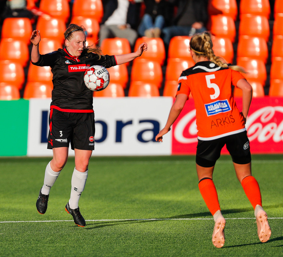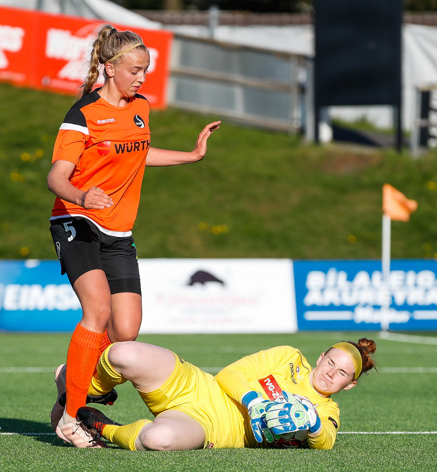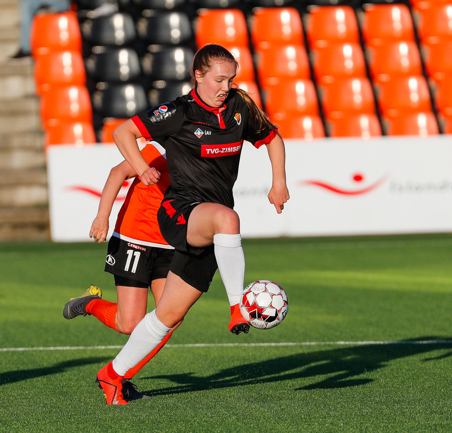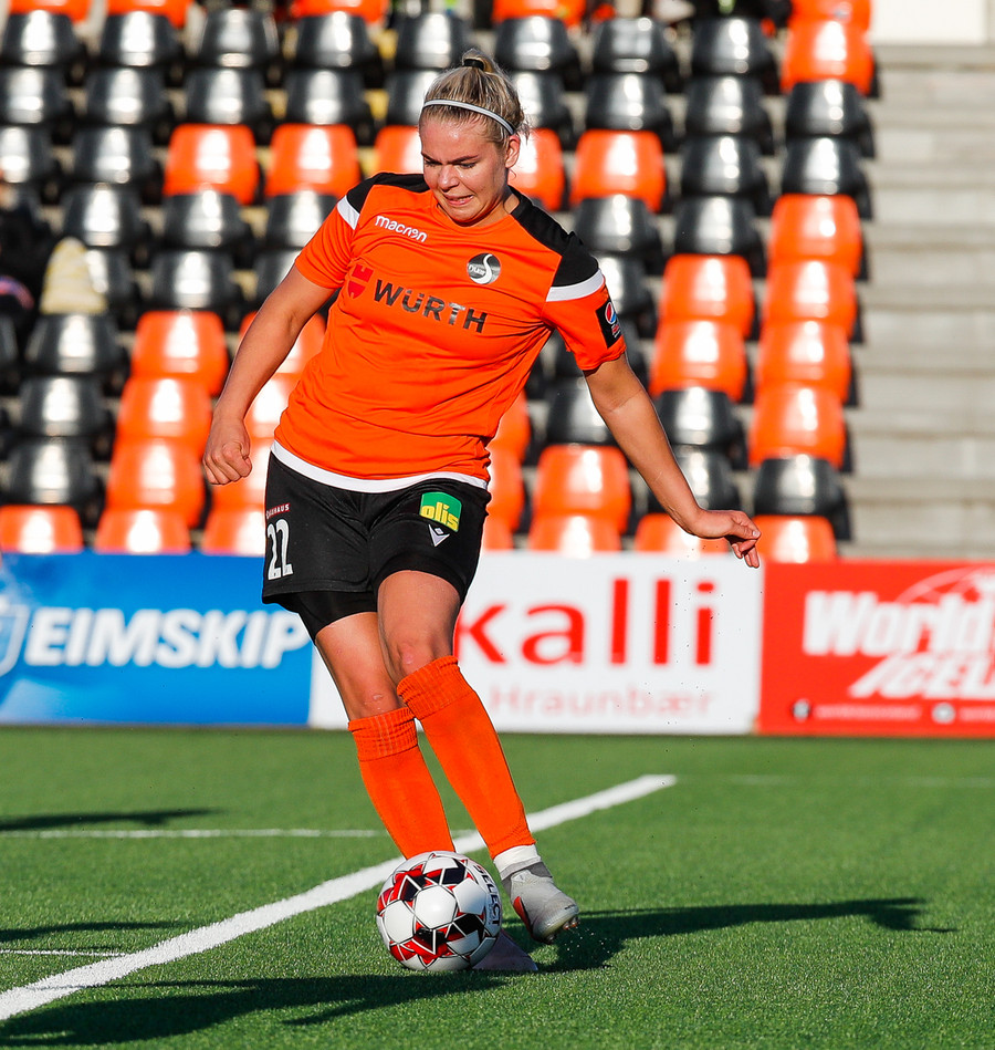 Fatma Kara er nokkuð bjartsýn að heimta víti eftir að skot hennar fór í höfuð varnarmanns. En gestirnir vinna hornspyrnu rétt fyrir utan teiginn, Þórhildur mundar skotfótinn...