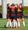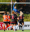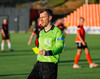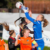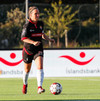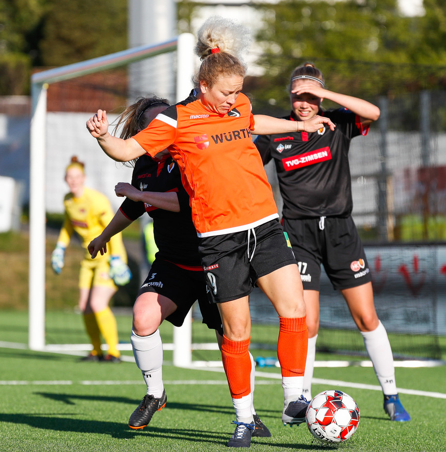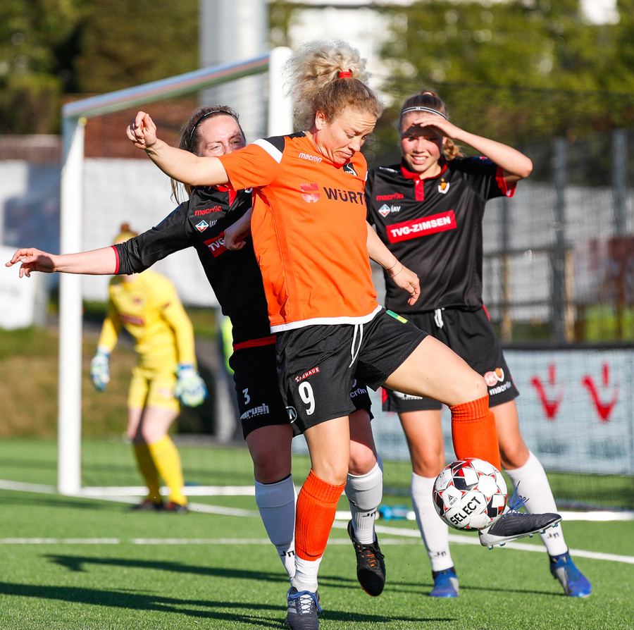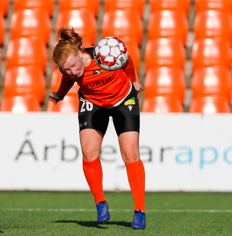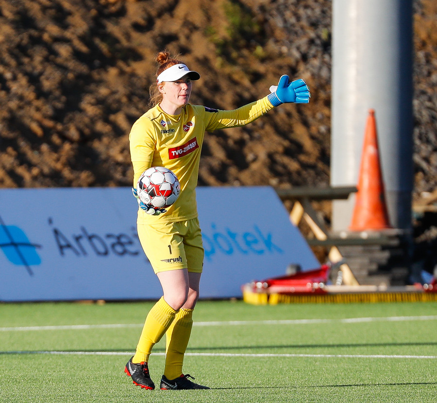 Fatma Kara er nokkuð bjartsýn að heimta víti eftir að skot hennar fór í höfuð varnarmanns. En gestirnir vinna hornspyrnu rétt fyrir utan teiginn, Þórhildur mundar skotfótinn...