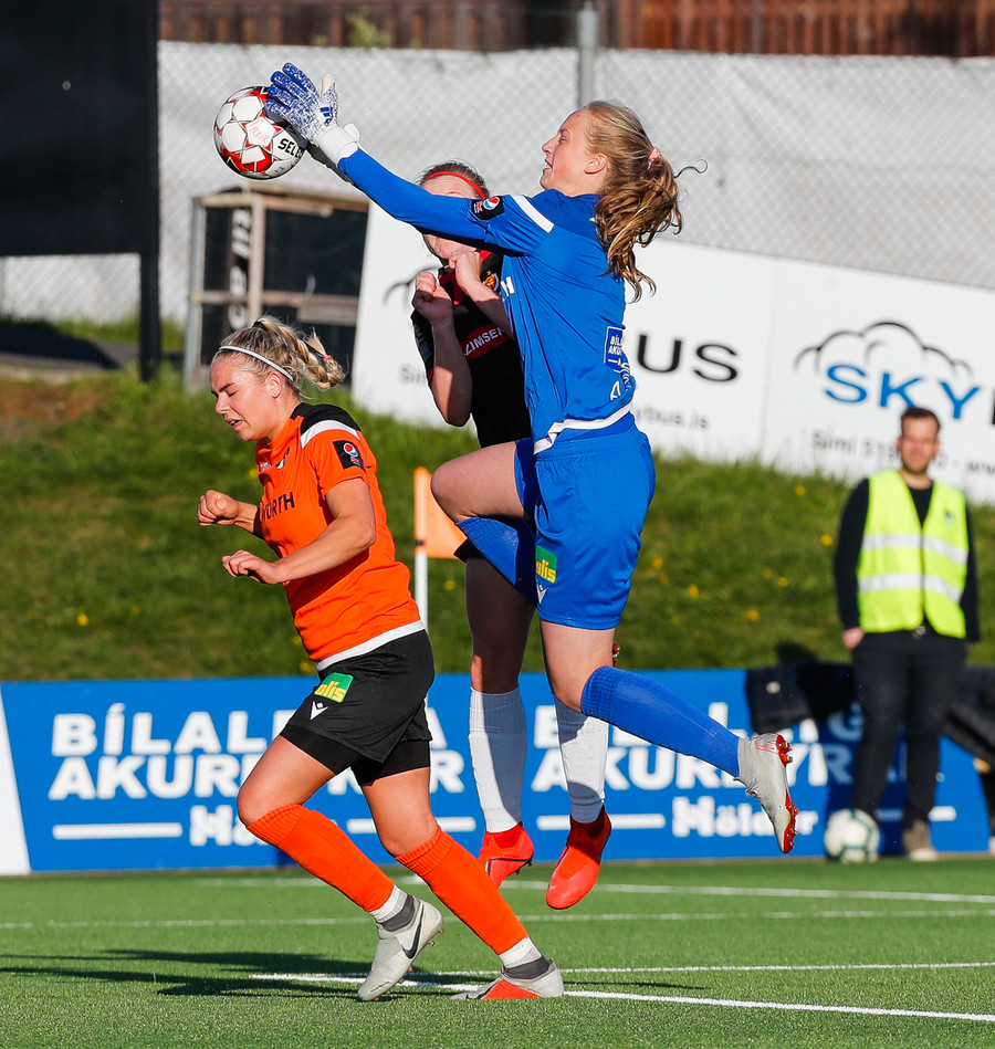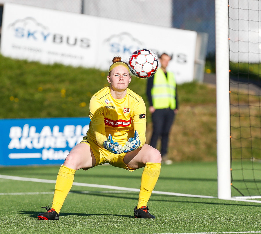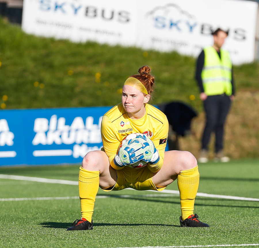 Ekki viss um hvort þetta var fín sending eða lúmskt skot á mark gestanna, en Halla gerir vel að grípa boltann.