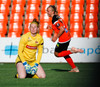 Boltinn dettur í markteignum og er skallaður út í teiginn þar sem Karólína er mætt, hún lúðrar honum af öllu afli í hliðar netið á markinu.
