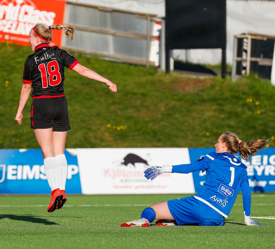 Þvert á gang leiksins, hryllilegur kaufaskapur hjá Huldu. Gestirnir komust í skyndisókn og Simone skýtur, boltinn á leið framhjá en Hulda var komin í tæklinguna og gat lítið gert þegar boltinn skopaði af henni og inn.