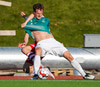 Hann missir boltann og dettur í baráttu á miðjunni en reynir að kasta sér áfram með hausinn í boltann til að skalla hann frá Blikanum en fékk svo dæmda aukaspyrnu.