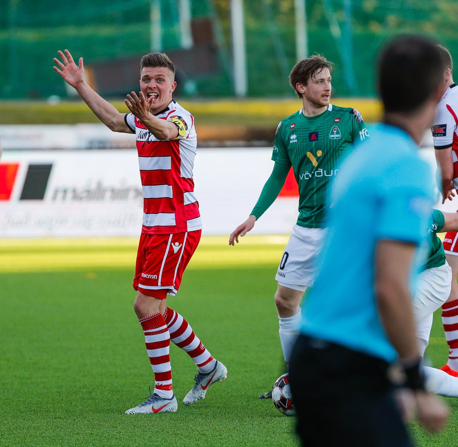 Þetta er eitt það steiktasta sem ég hef séð, það er brotið á Thomasi, sem að stoppar svo boltann með höndunum og byrjar að hlaupa af stað með hann, þegar Ívar byrjar að flauta á fullu til að biðja hann um að taka aukaspyrnu þá sparkar hann boltanum upp í hornið.