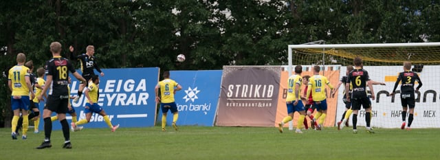 Almarr er hér dæmdur brotlegur rétt fyrir utan teig. Tryggvi Hrafn ætlar að taka spyrnuna.