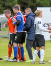 Jóhann Ingi hugsar sig um og endar á að gefa Morten Beck rautt spjald. Hárréttur dómur að mínu mati þótt þetta hafi að öllum líkindum verið óviljaverk. Ólafur Ingi og Brandur fá síðan gult fyrir sinn þátt í þessu.