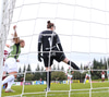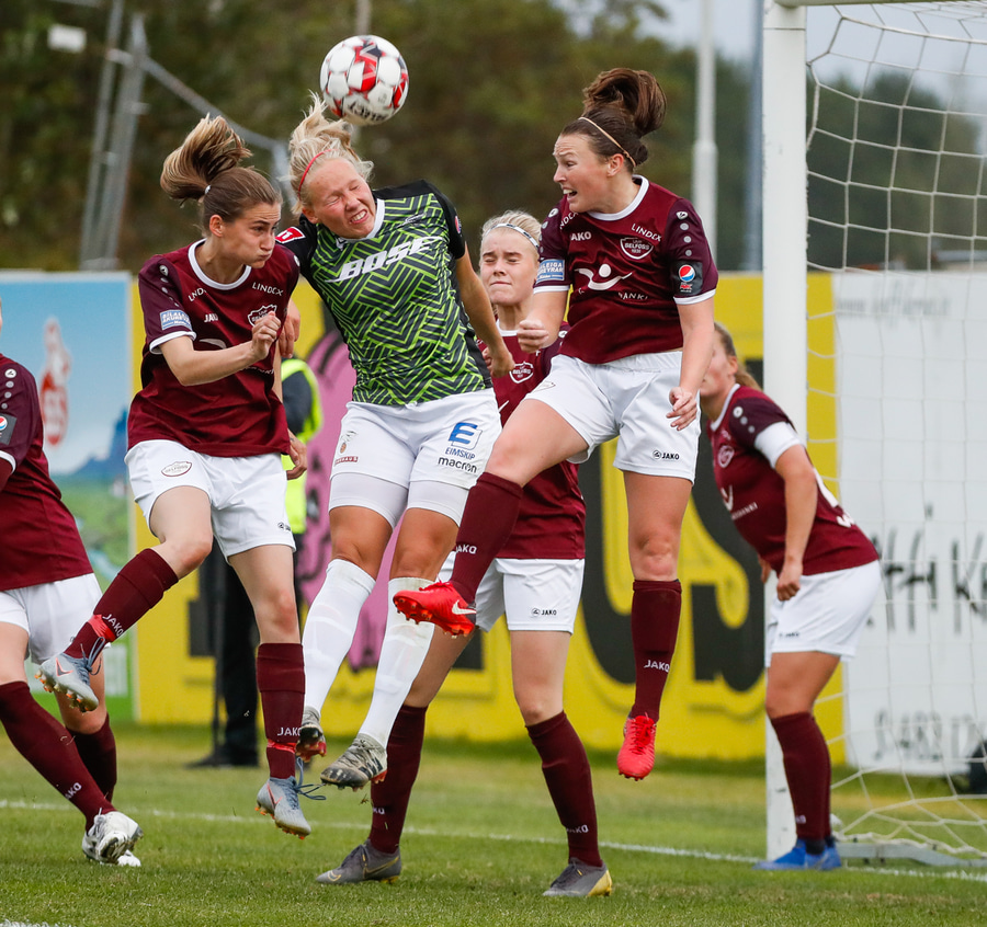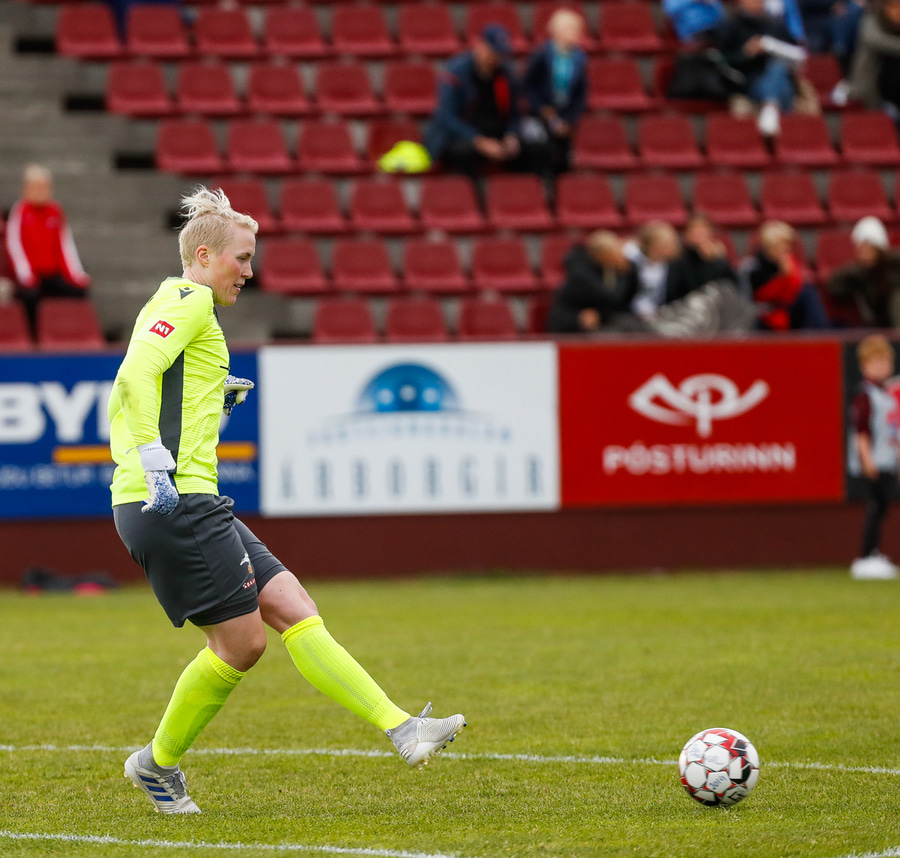 Halla gerir vel í að stoppa Elínu Mettu sem var að komast í fínan séns í teignum. Setur boltann í horn.
