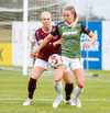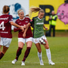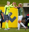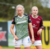 Liðin eru nú bæði komin út á völl. Heimakonur í sínum vínrauðu treyjum og gestirnir í grænu. Það tekur smá tíma að venjast því.