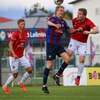 Sean De Silva með baneitraða sendingu inn í teiginn og Aron var hársbreidd frá því að ná til boltans!