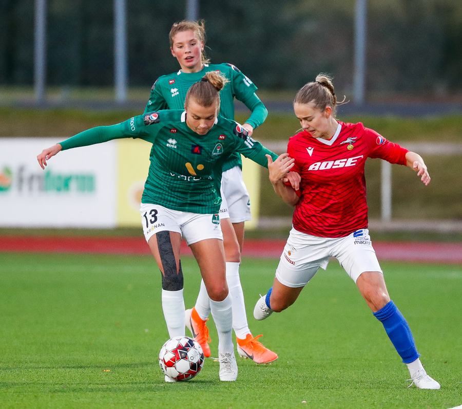 Hlín kemst utaná Áslaugu og neglir boltanum fyrir þar sem Selma Sól tæklar boltann í Heiðdísi og þaðan í smettið á Selmu.