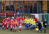 Shannon Simon tekur upphafsspyrnuna fyrir Grindavík sem leikur í átt að miðbænum.