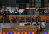 Þjóðsöngvarnir eru að baki. Það má heyra saumnál detta í stúkunni. Aðeins í kringum 60 áhorfendur eru mættir! Fullt af lausum sætum.