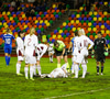 Leikmaður Letta sem þurfti aðhlynninguna áðan er mættur aftur inn. Lenti í drullupollinum í markteignum og treyjan hennar er nánast meira brún en hvít. Meiri drullan!