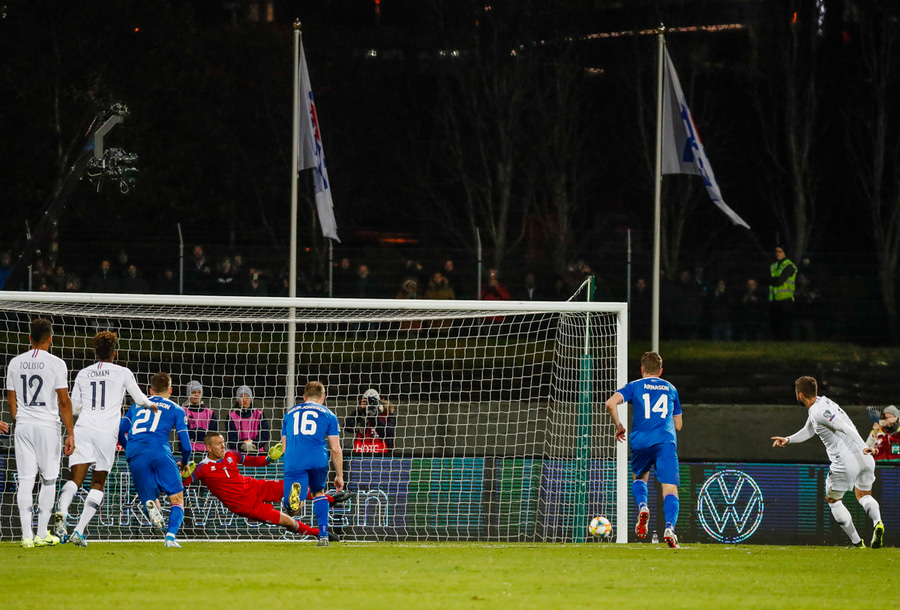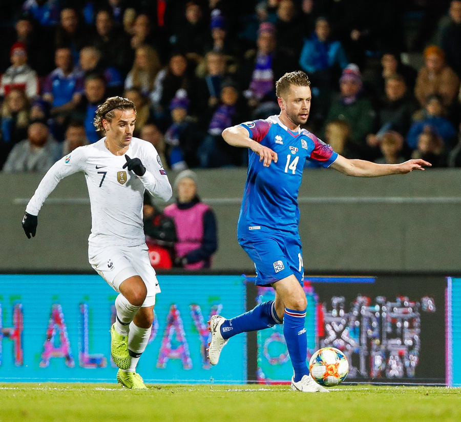 Tekin stutt, Griezmann fær hann í fætur og kemur með hræðilega fyrirgjöf sem fer aftur fyrir. Uppsker lófaklapp íslenskra stuðningsmanna.