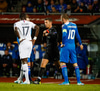 Vilja meina að Kári hafi handleikið knöttinn en Ítalinn ekki sammála. Giroud er brjálaður og uppsker gult spjald fyrir tuð!