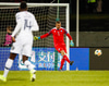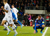 Þessi leit vel út í loftinu en að lokum svífur boltinn yfir mark Frakkanna.